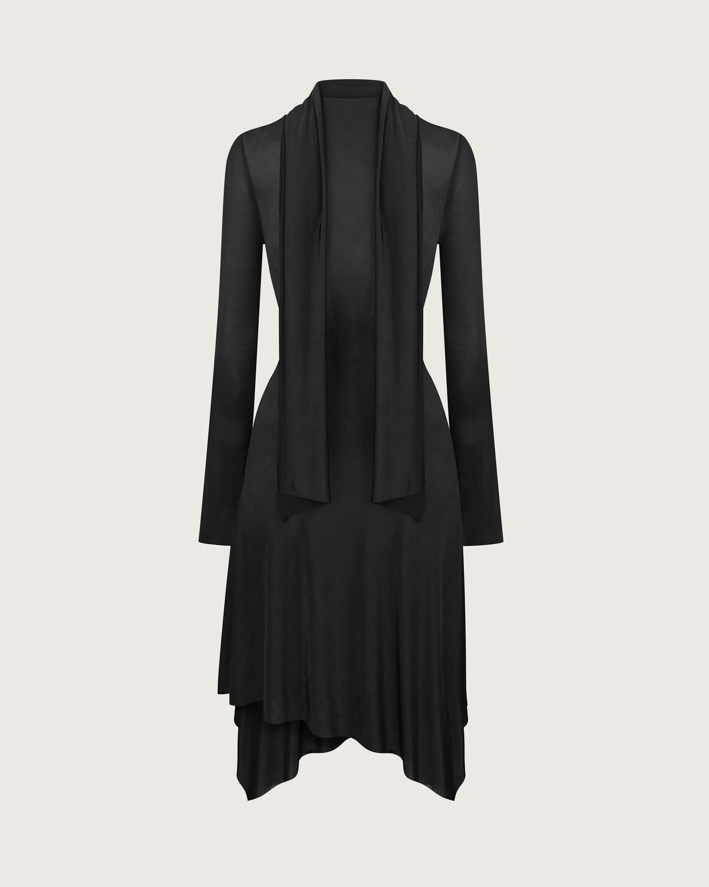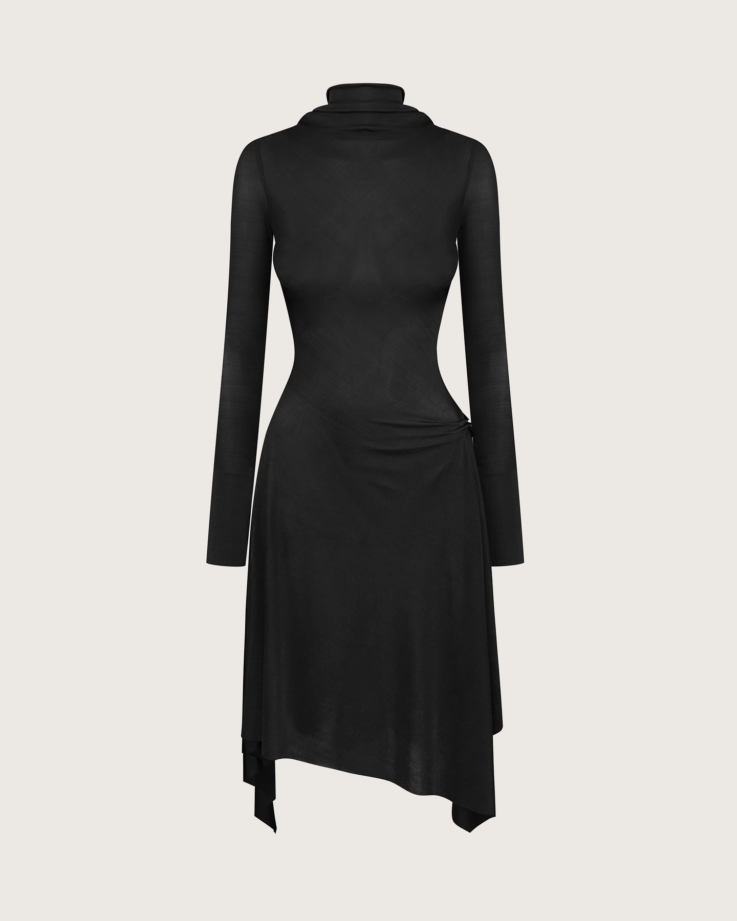 A body-skimming dress crafted in smooth crepe jersey selected for its refined fluidity and subtle luster. Animated by artful draping at the waist and an elegantly staggered hemline. Designed to drape around the body. Mock neckline gathers into an adjustable tie at the nape.