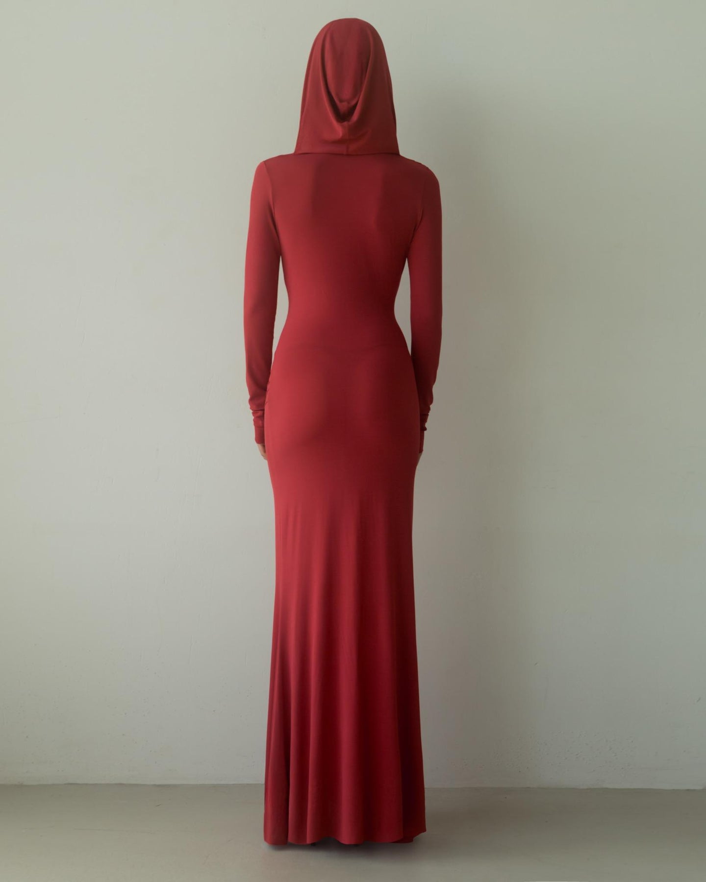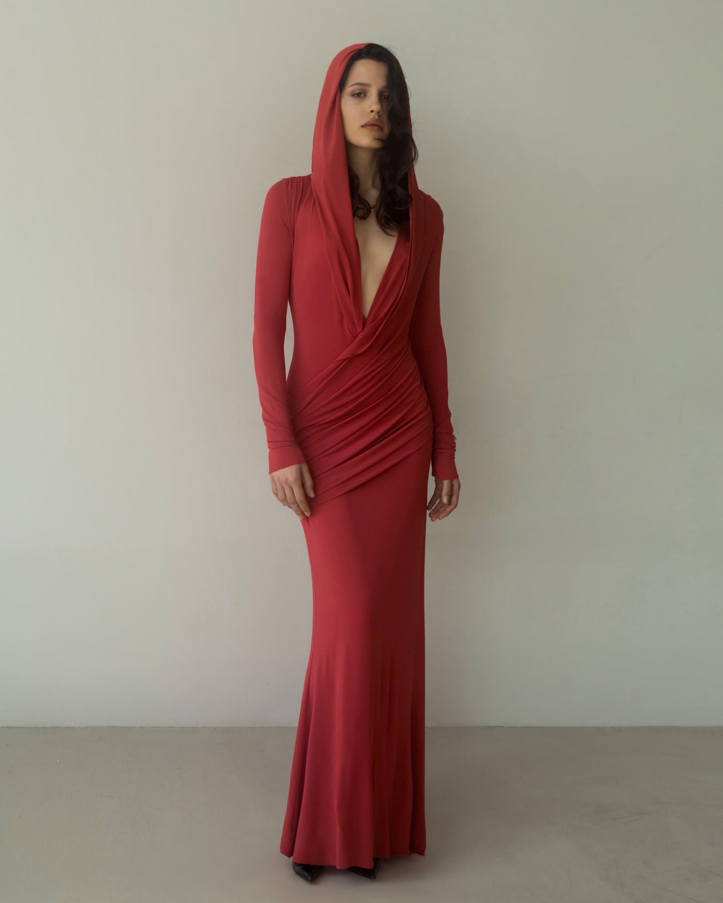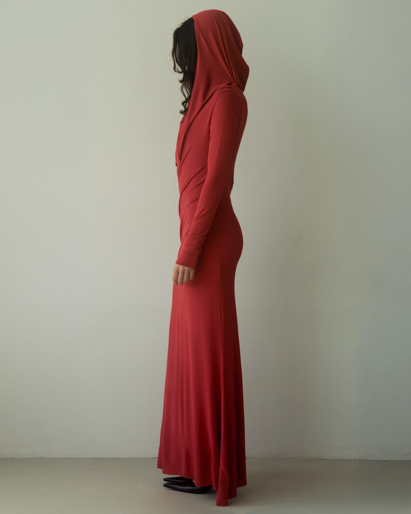 A long-sleeved knit dress that reimagines ease as elegance. Cut from fluid viscose jersey that articulates the tension between concealing and revealing. A draped plunging neckline is counterbalanced by a voluminous hood.