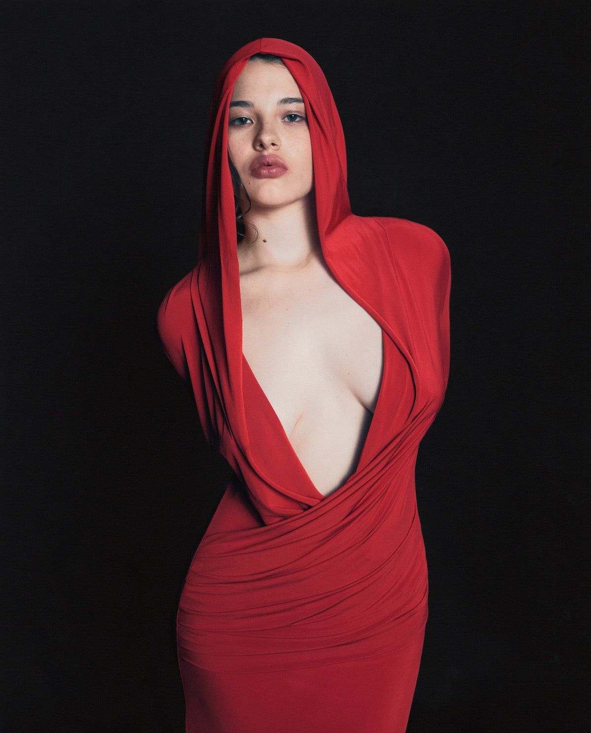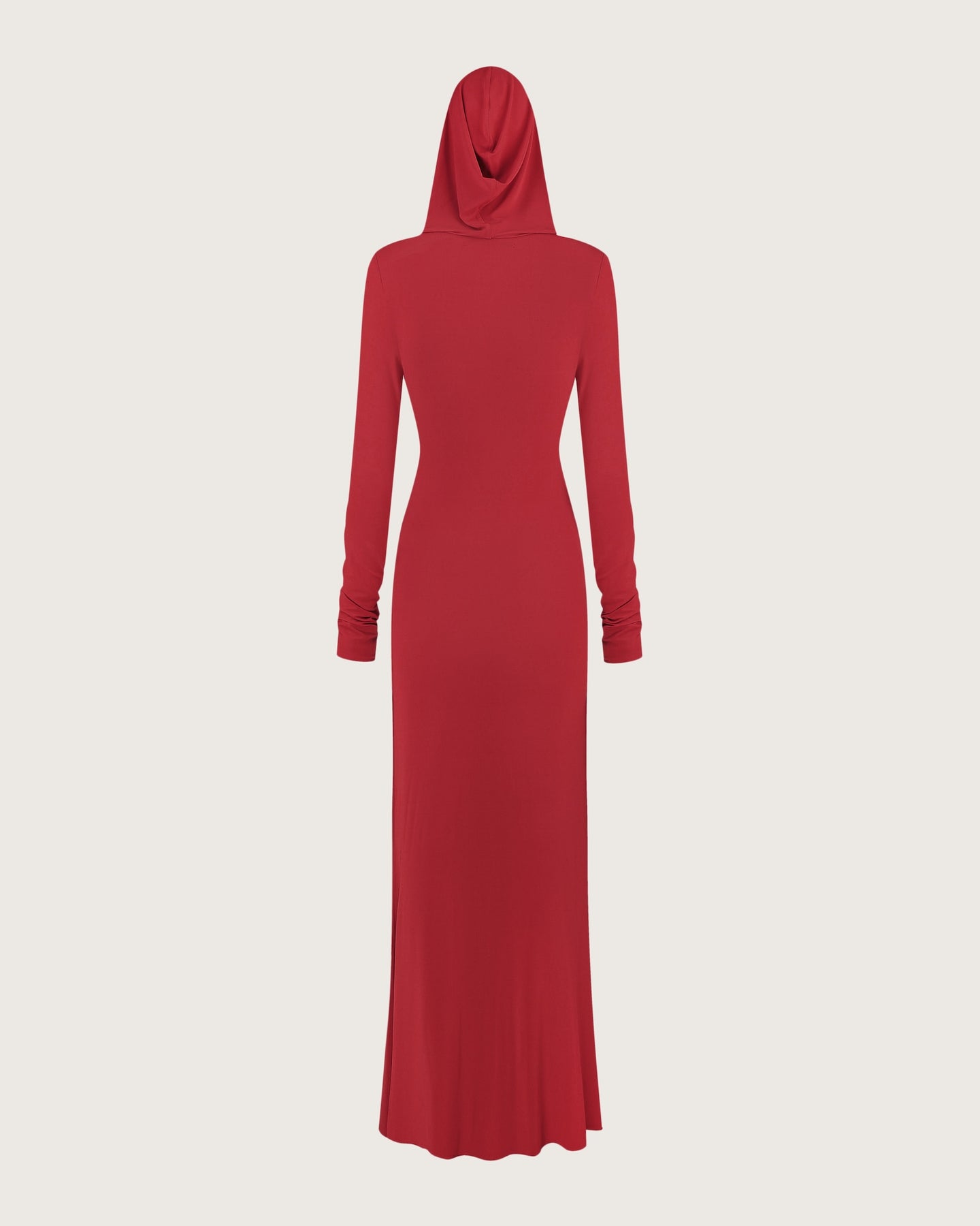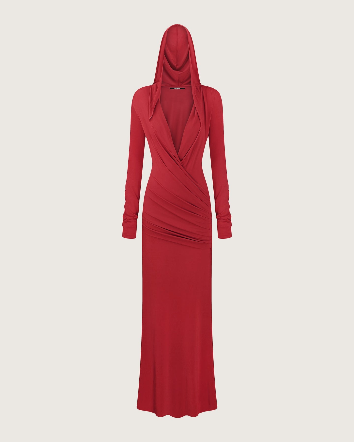 A long-sleeved knit dress that reimagines ease as elegance. Cut from fluid viscose jersey that articulates the tension between concealing and revealing. A draped plunging neckline is counterbalanced by a voluminous hood.