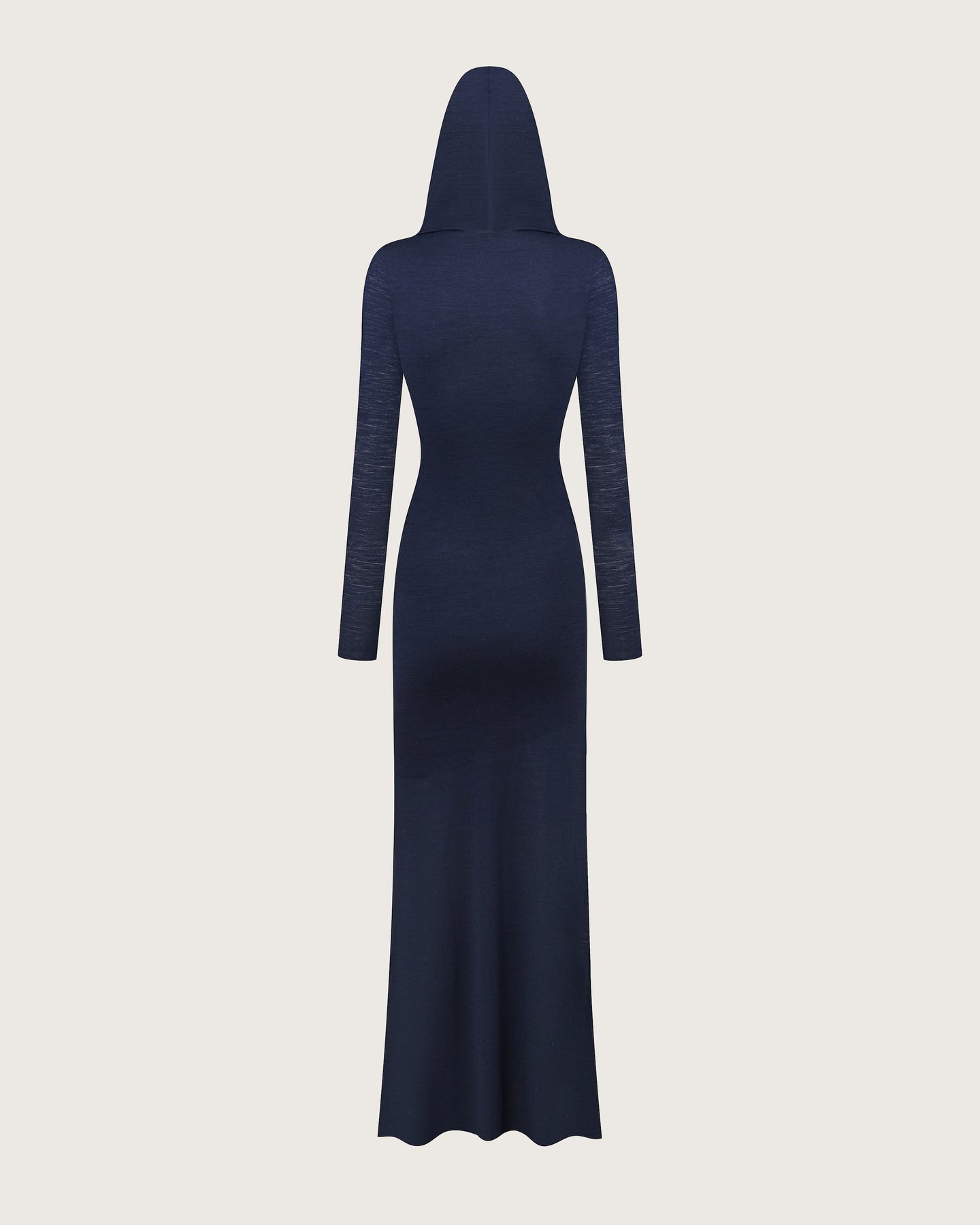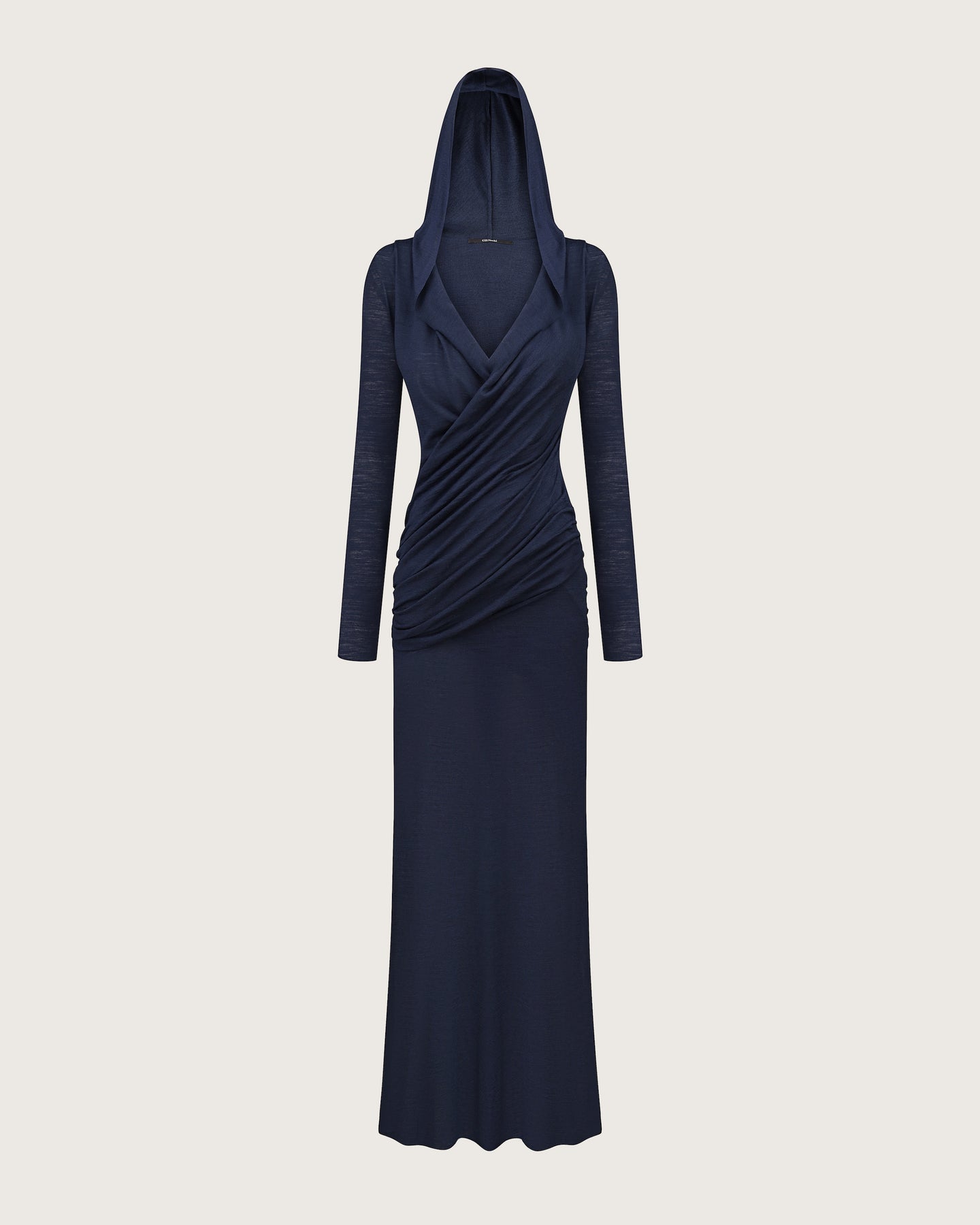 A floor-grazing dress designed to elongate. Crafted in a wool jersey selected for its languid stretch. An integrated hood plunges into a deep v-neckline. Long sleeves extend the line.