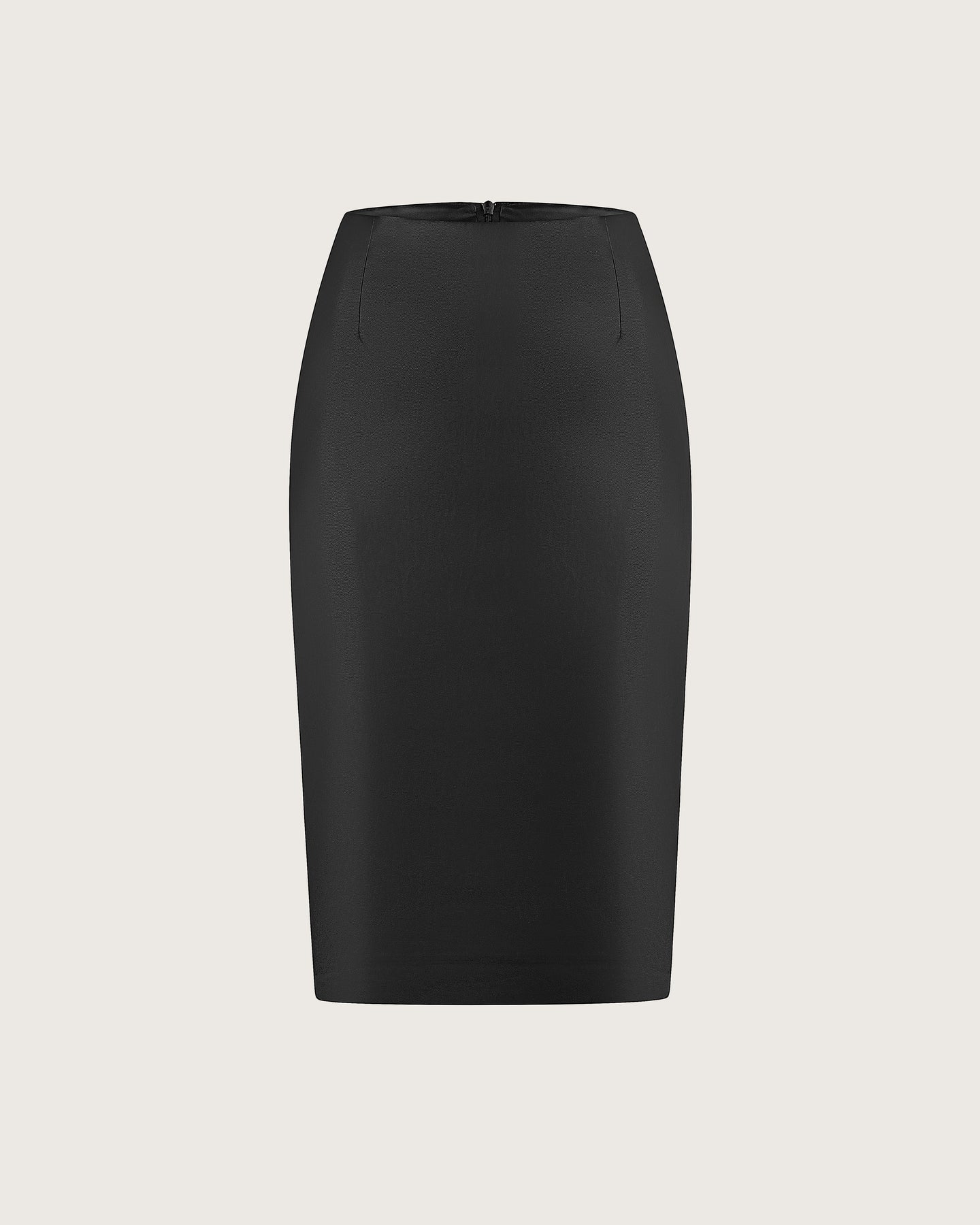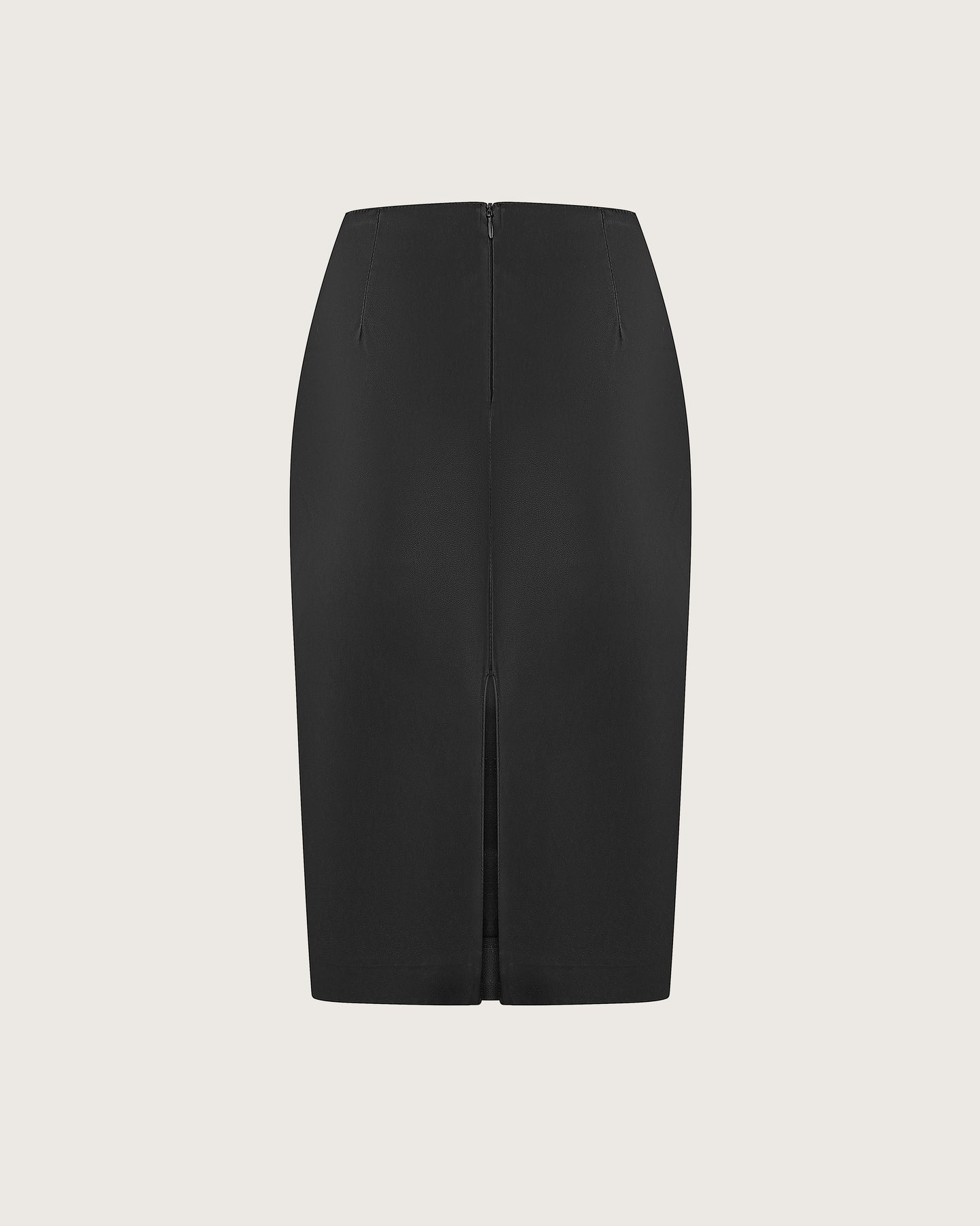 A low-slung pencil skirt that clasps the hips, shaped by darts. Crafted in lustrous faux leather with a slick finish. Concealed zipper and high slit at the back.