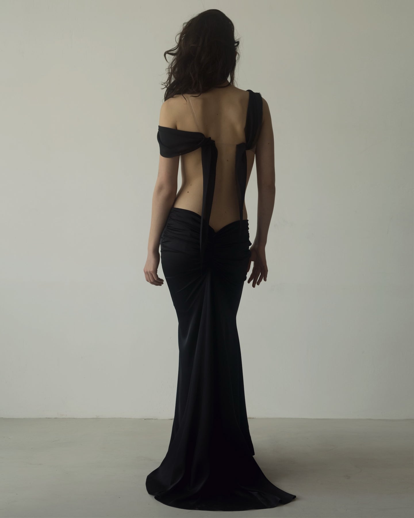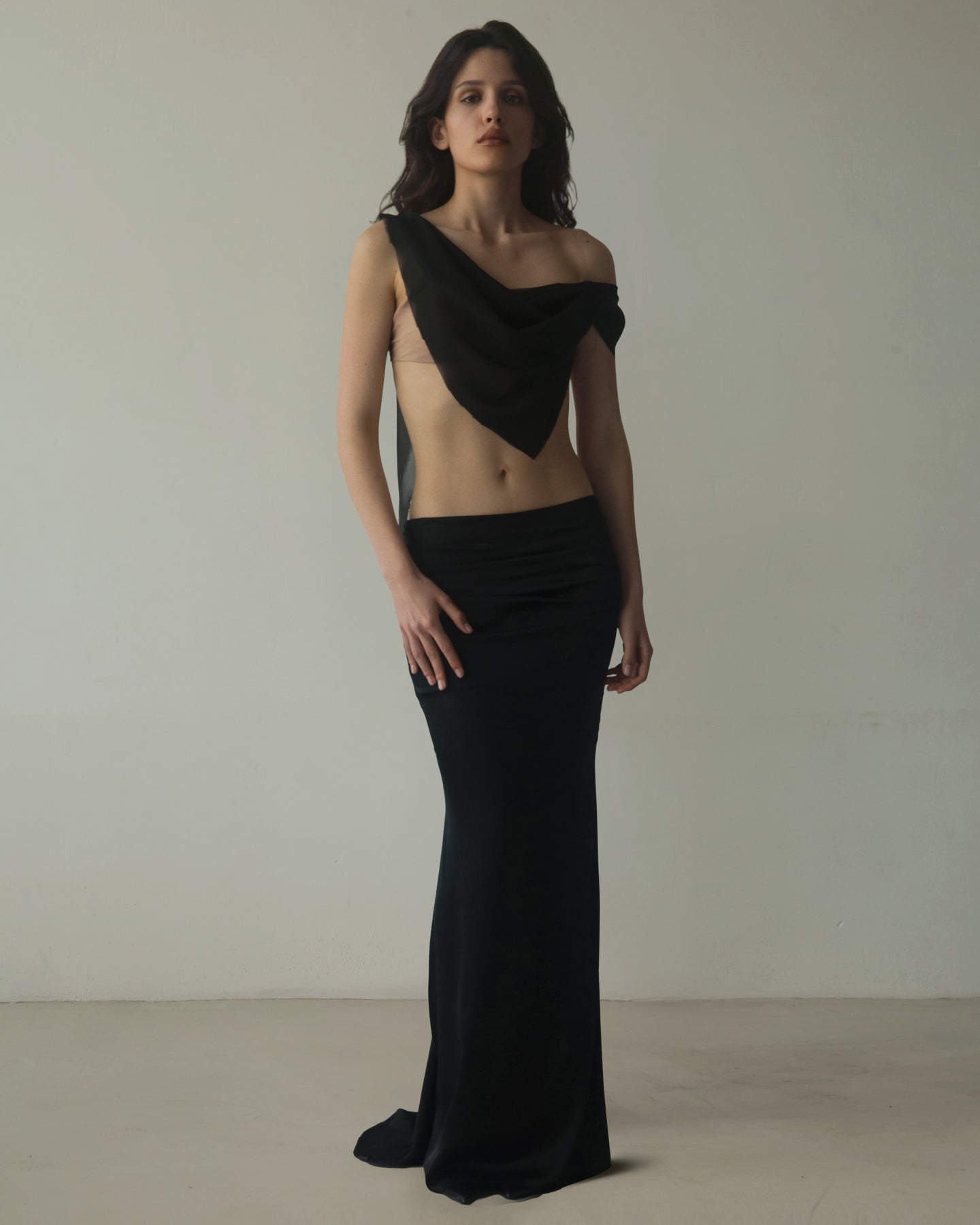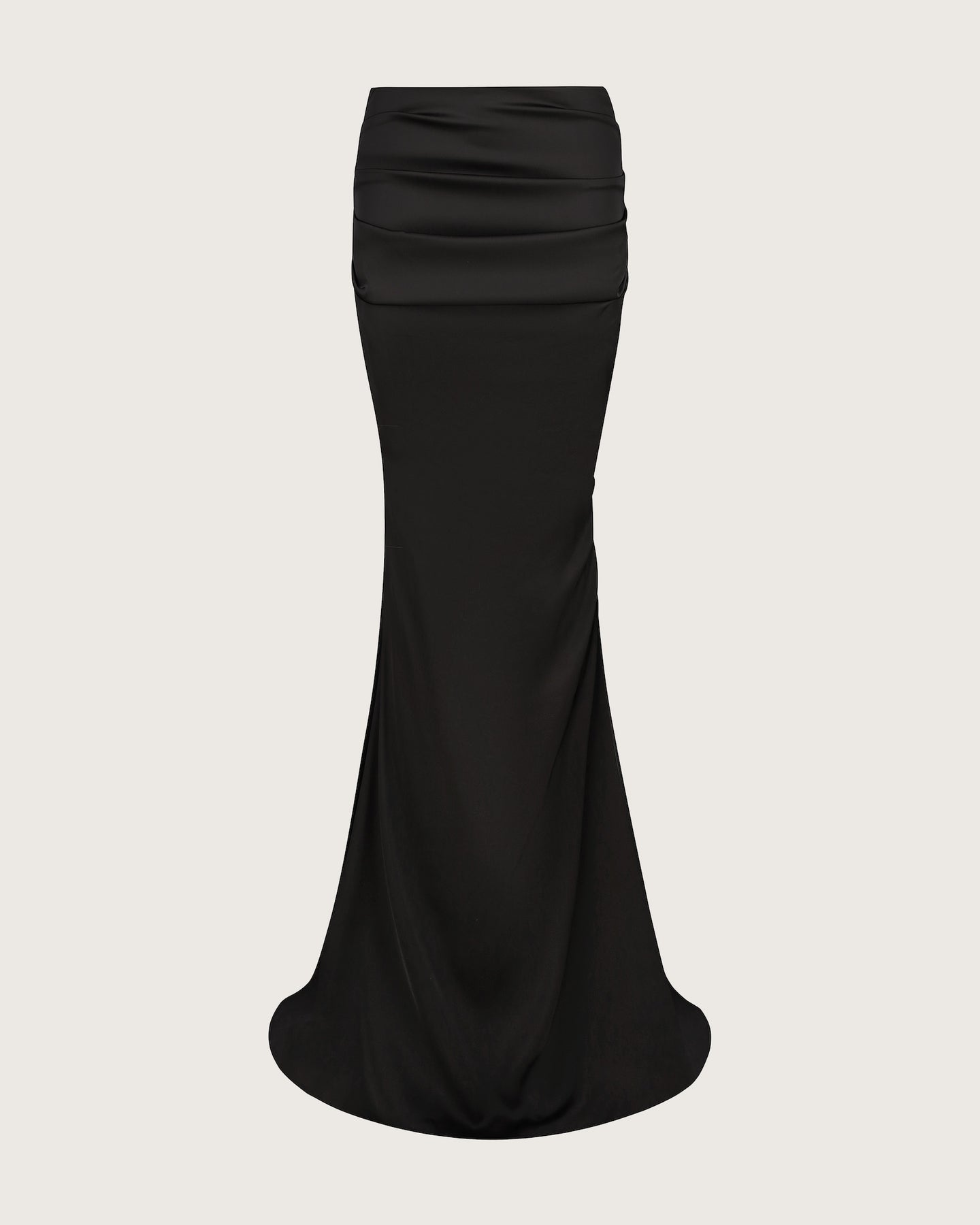 A floor-grazing column skirt rendered sensual through the sinuous drape of viscose crepe. Gathered at back to contour and define. Finished with a concealed back zipper.
