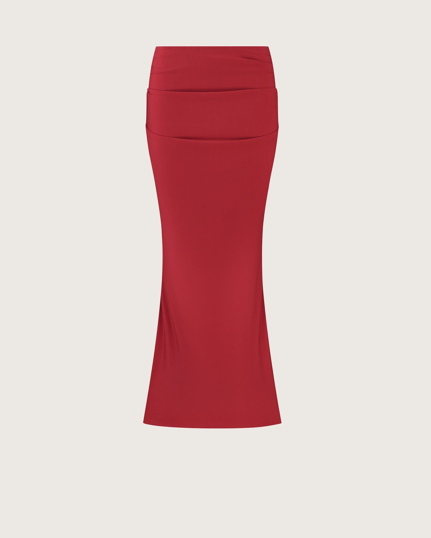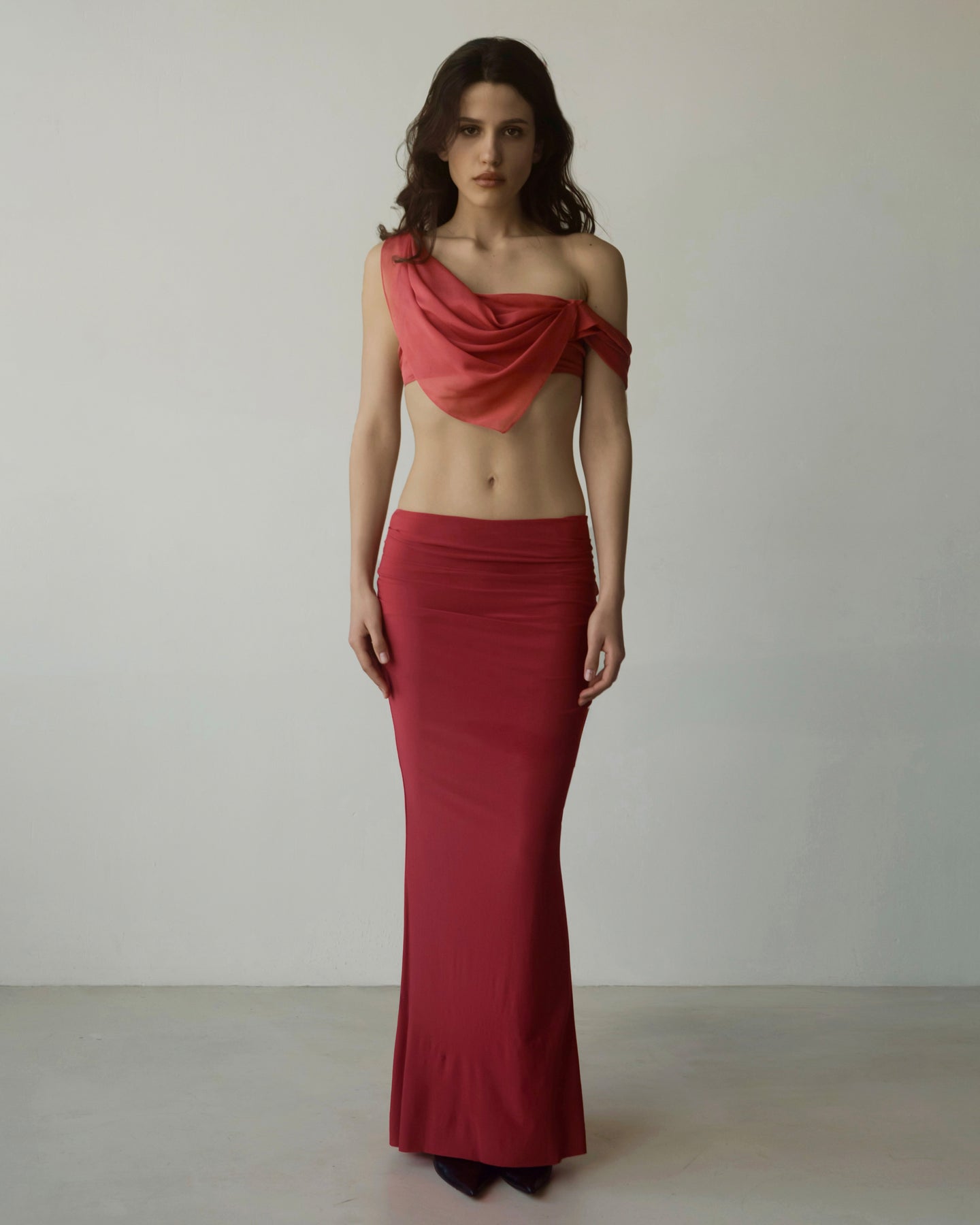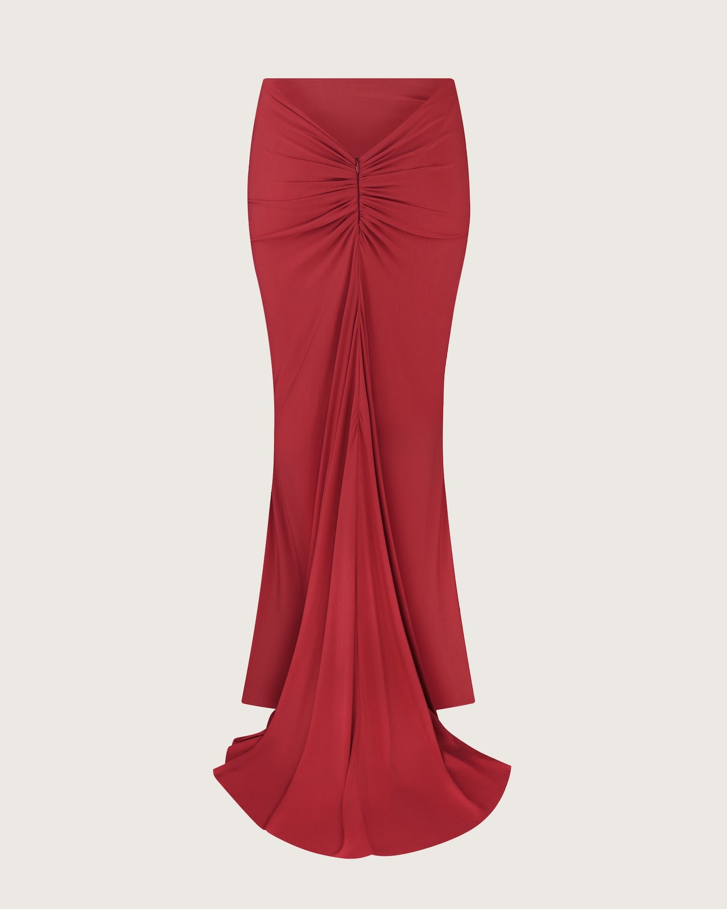A floor-grazing column skirt rendered sensual through the sinuous drape of viscose crepe. Gathered at back to contour and define. Finished with a concealed back zipper.