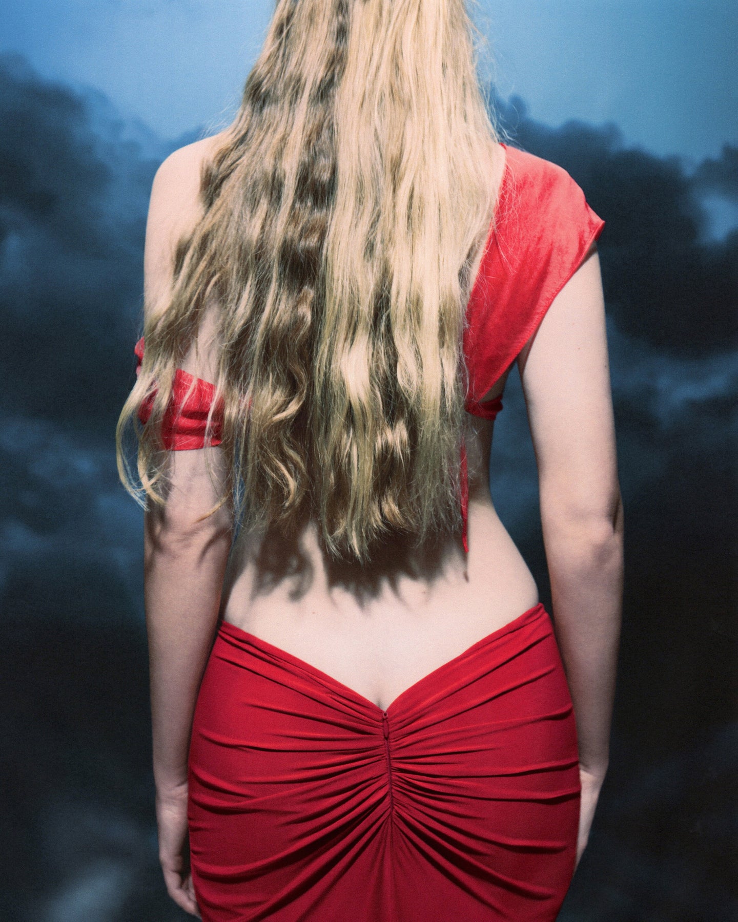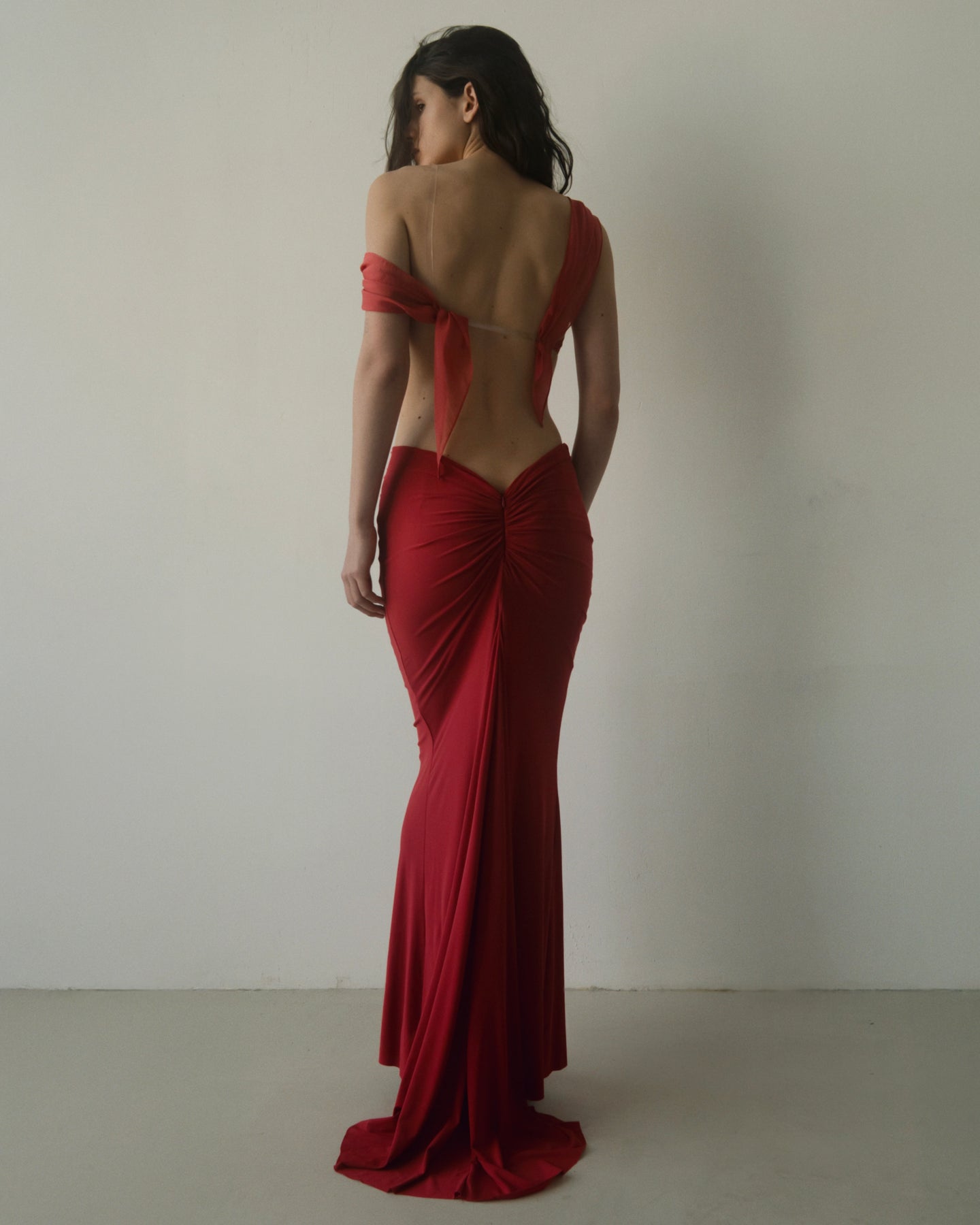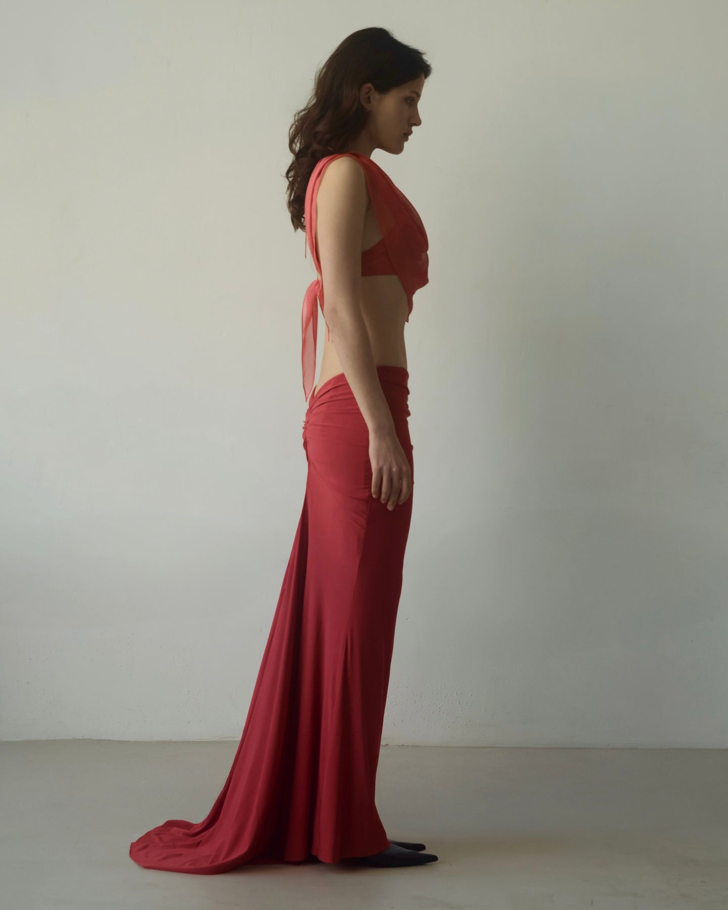 A floor-grazing column skirt rendered sensual through the sinuous drape of viscose crepe. Gathered at back to contour and define. Finished with a concealed back zipper.