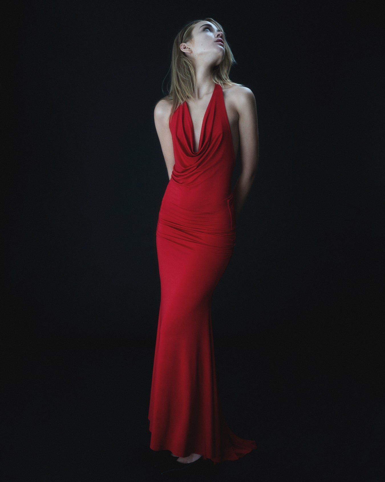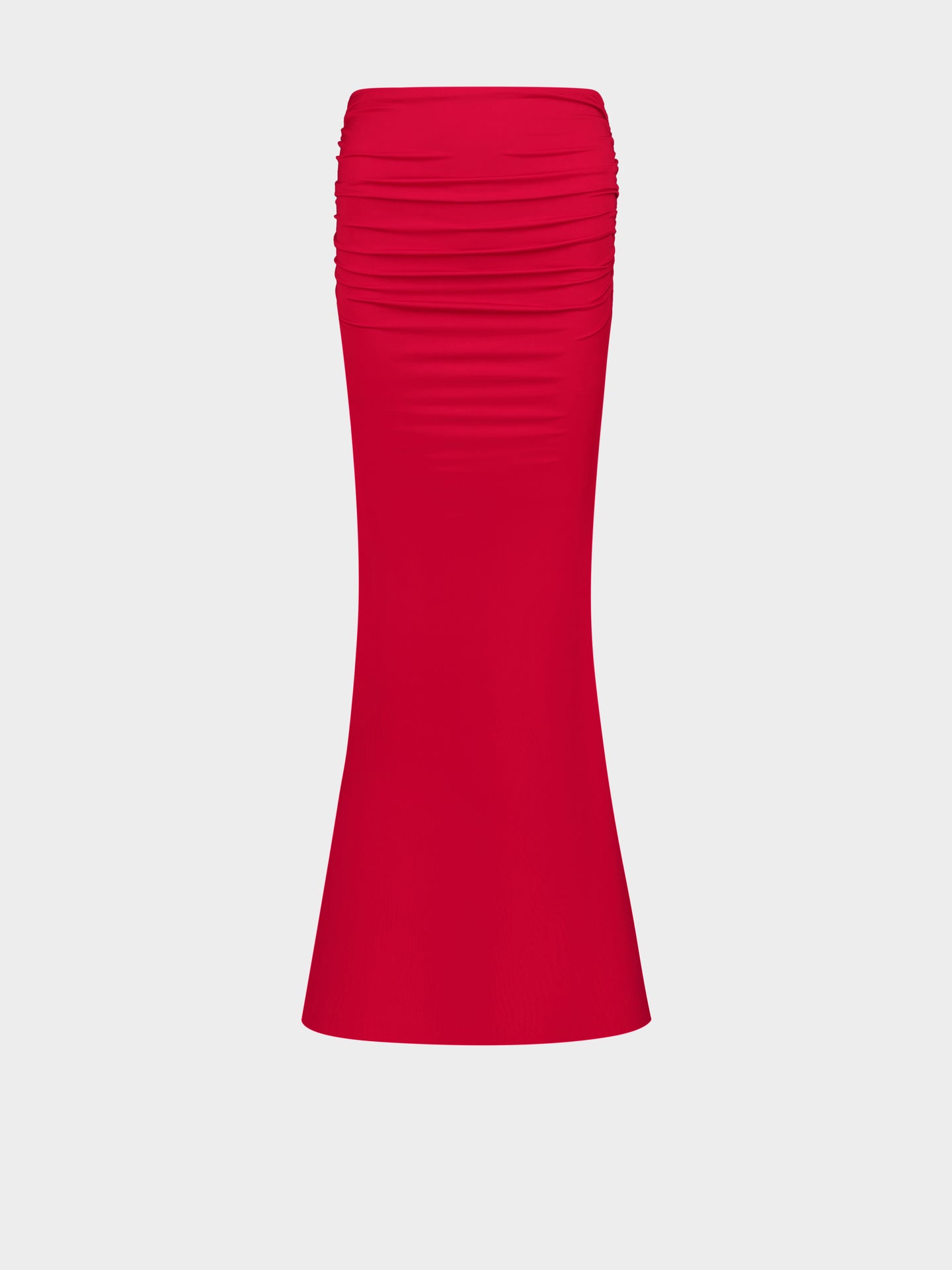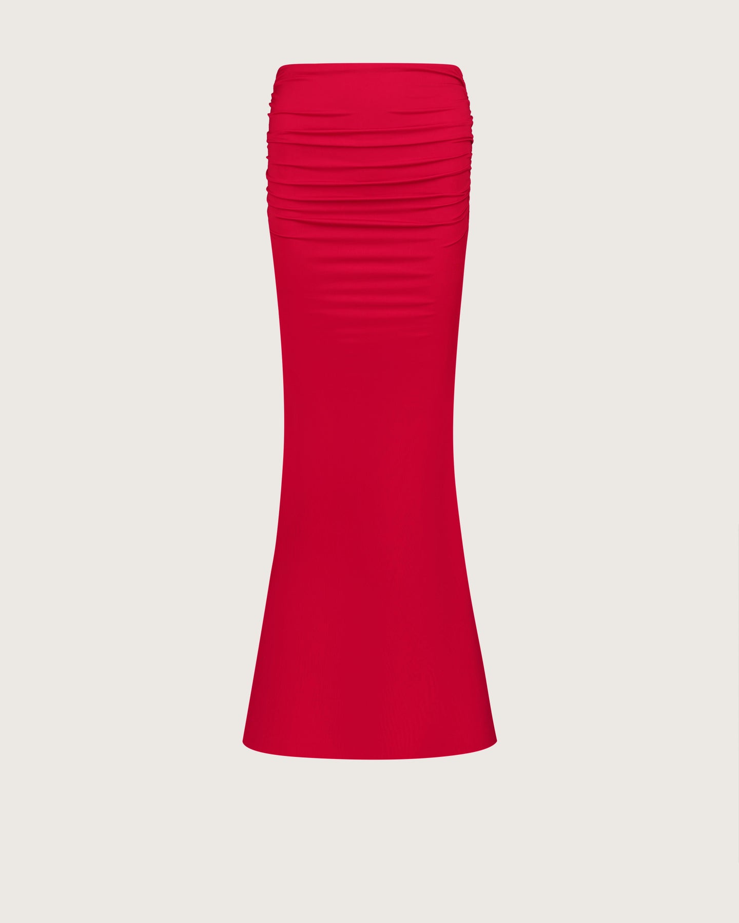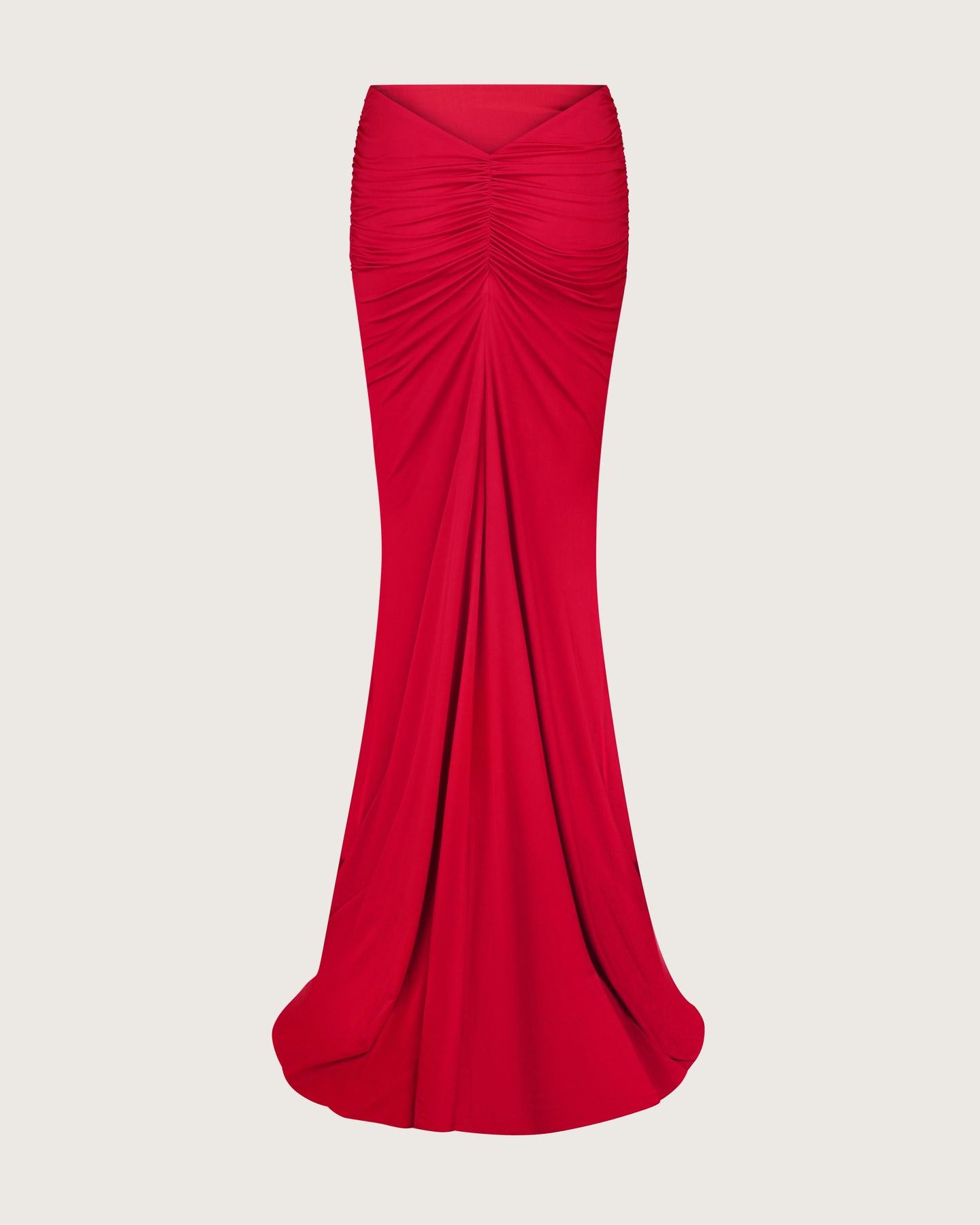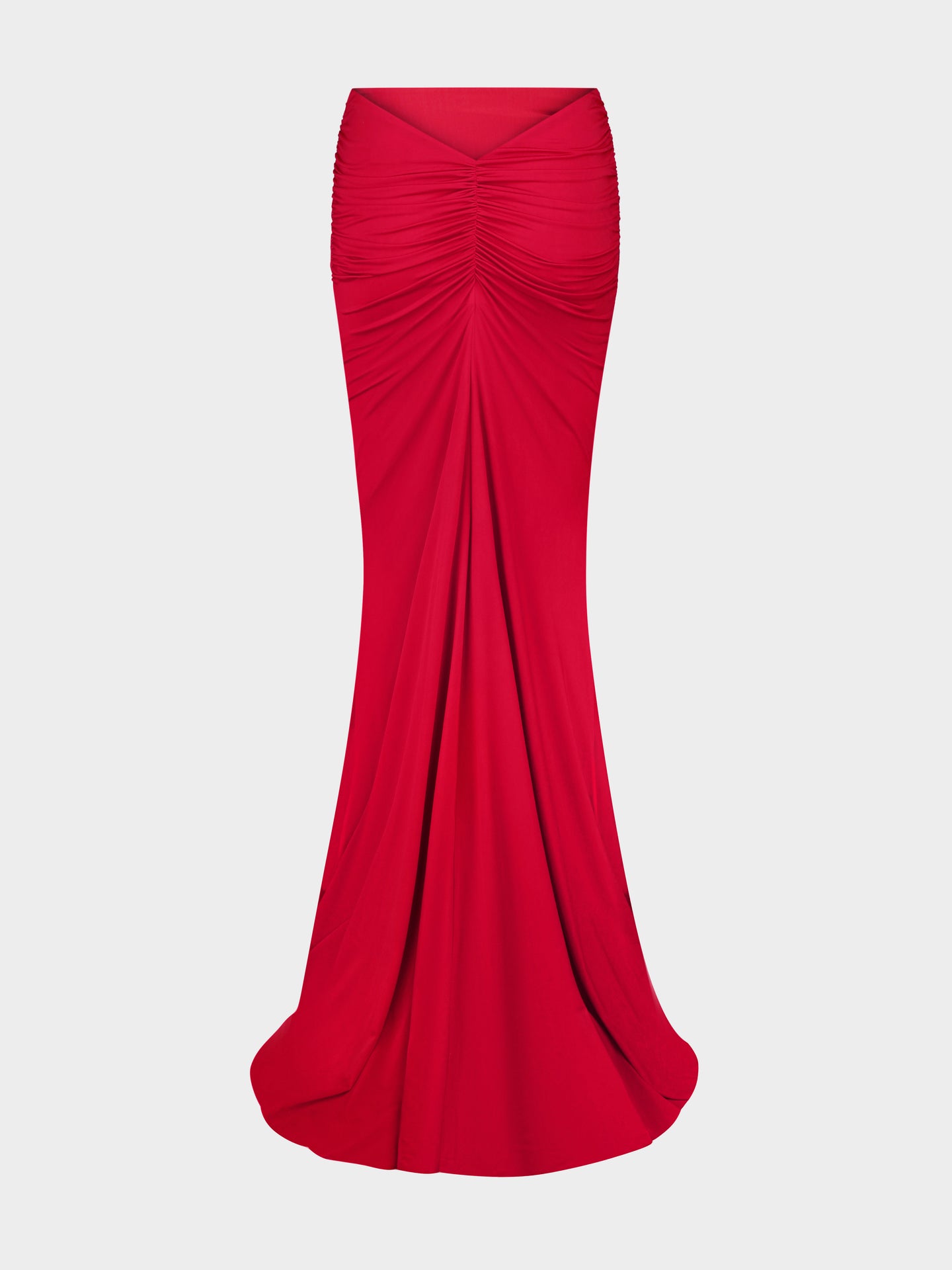 A floor-grazing column skirt rendered sensual through the sinuous drape of butter jersey. Gathered at back to contour and define.
