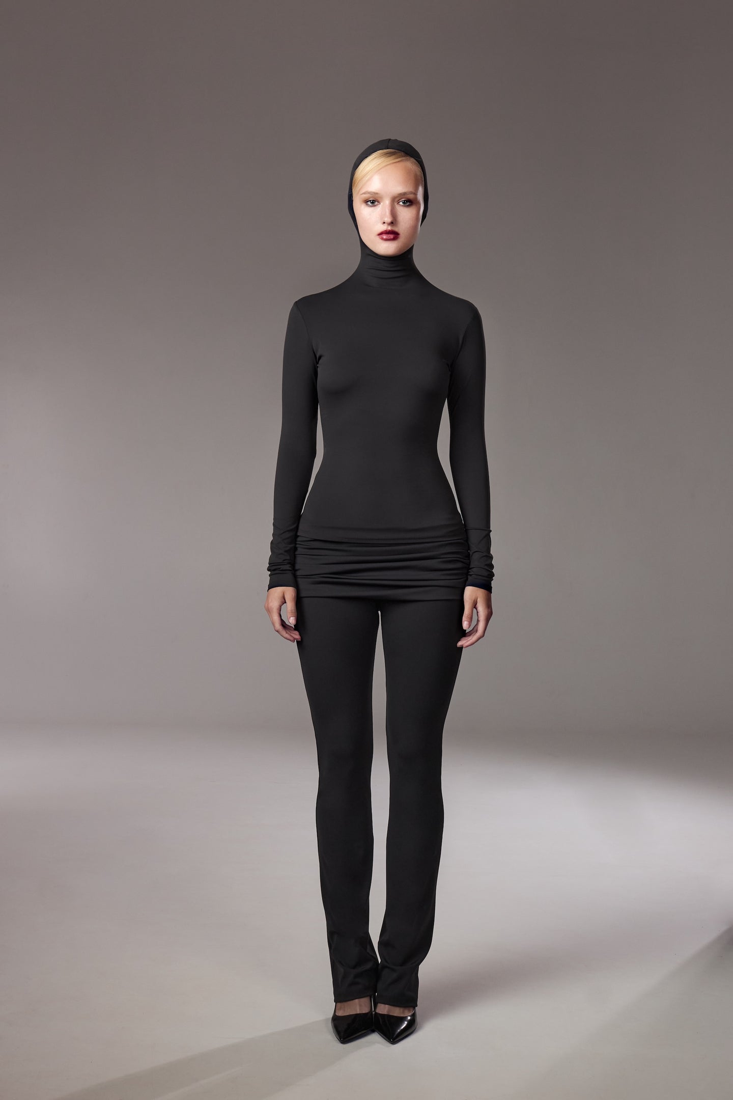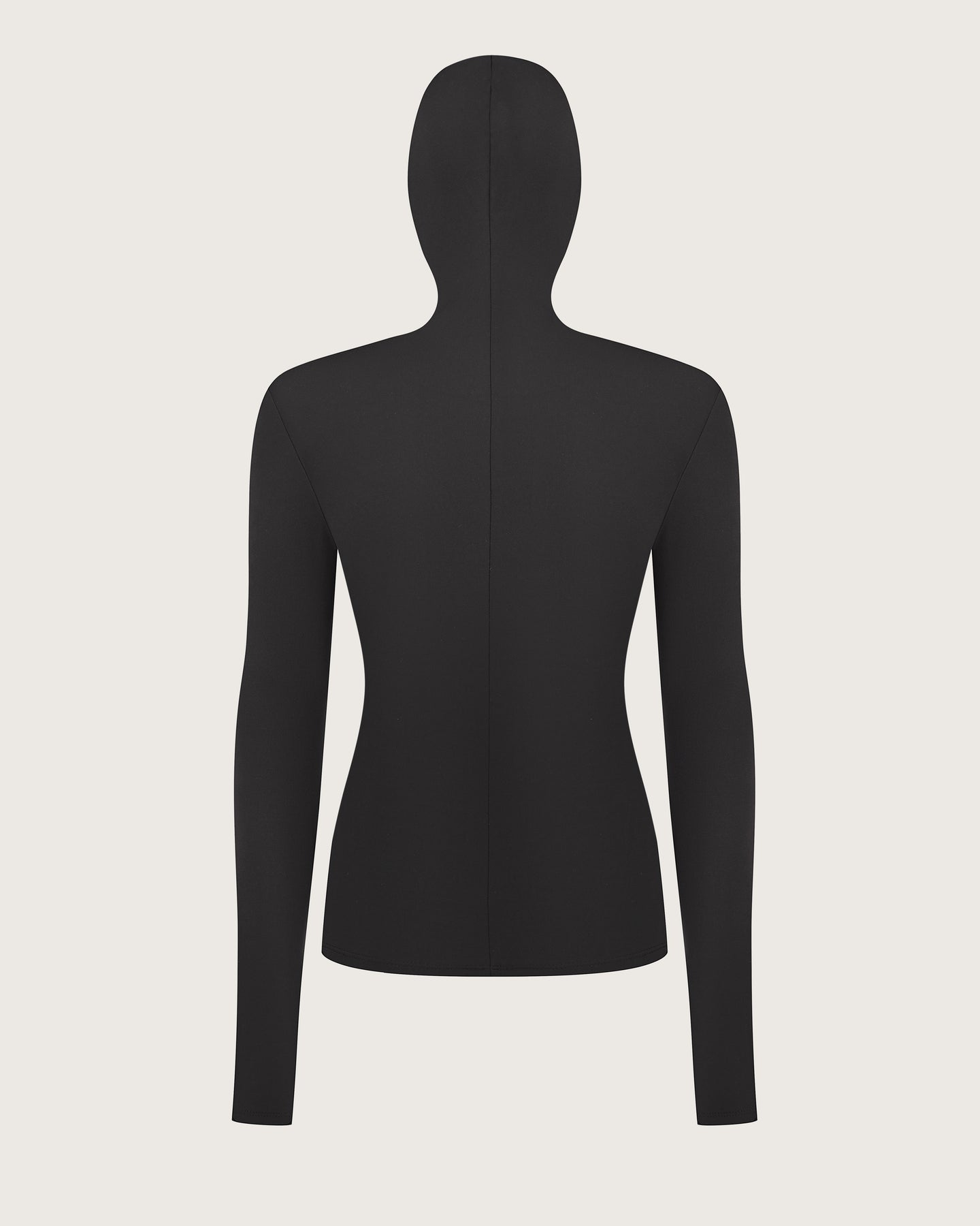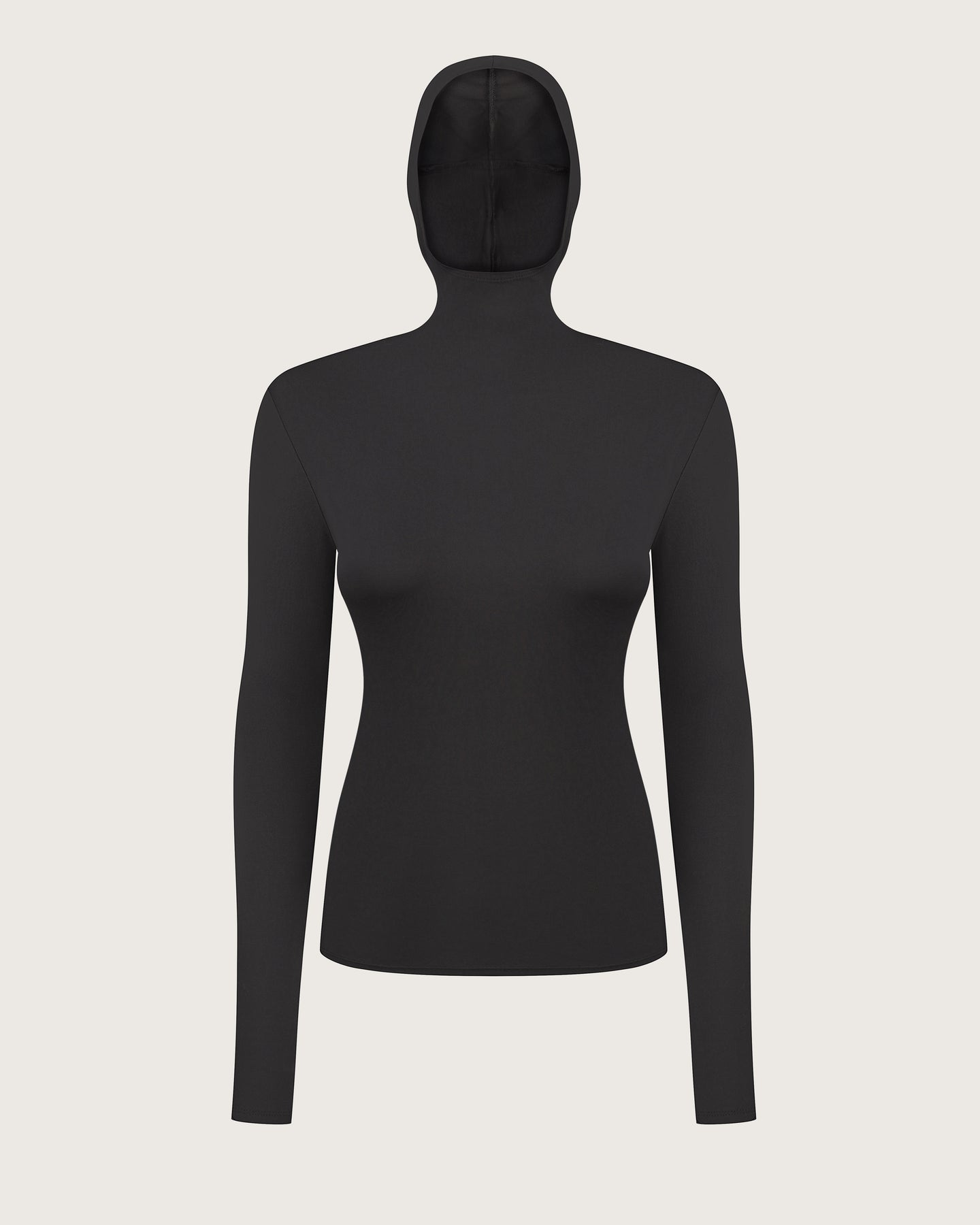 A silhouette-skimming top in a lustrous knit with a refined sheen and form-fitting hood. Pull-on style with clean finishes.