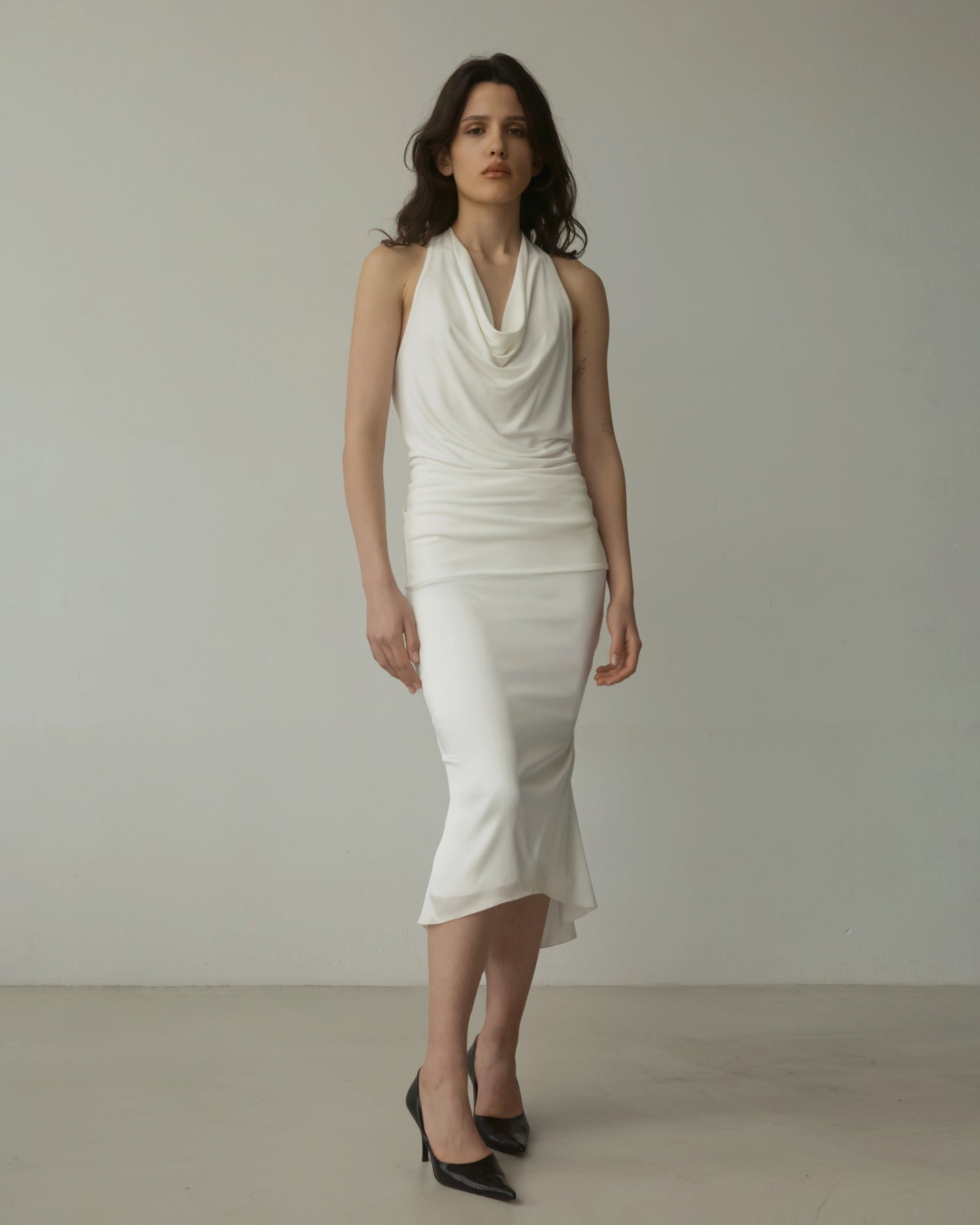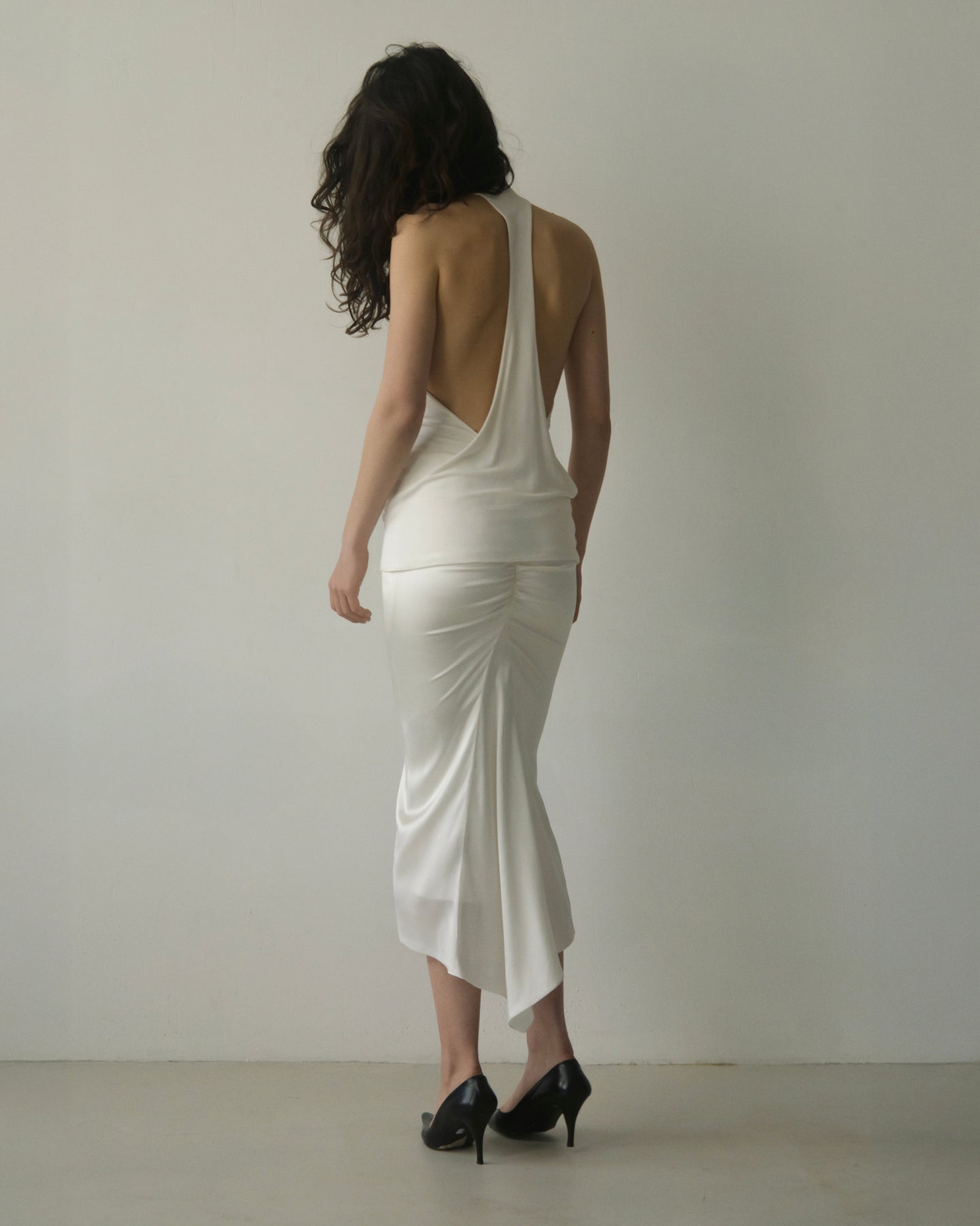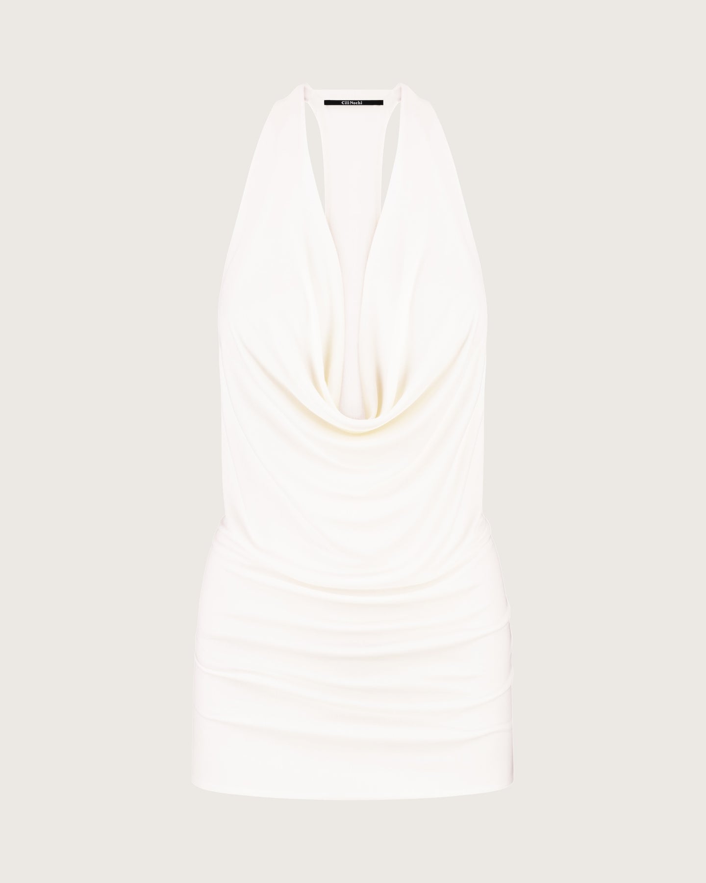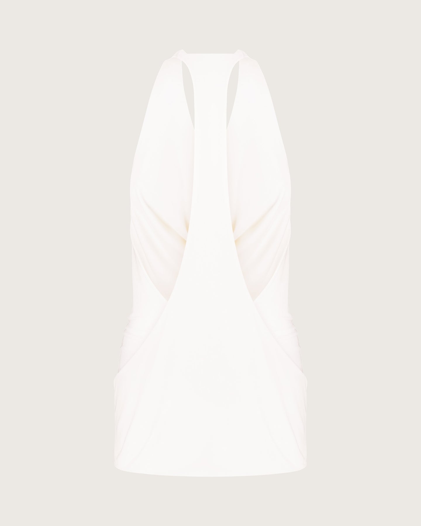 An easy-fitting draped u-neckline top in the fluid drape of viscose crepe. Soft u-neckline and bare racer back that plunges to the waist.
