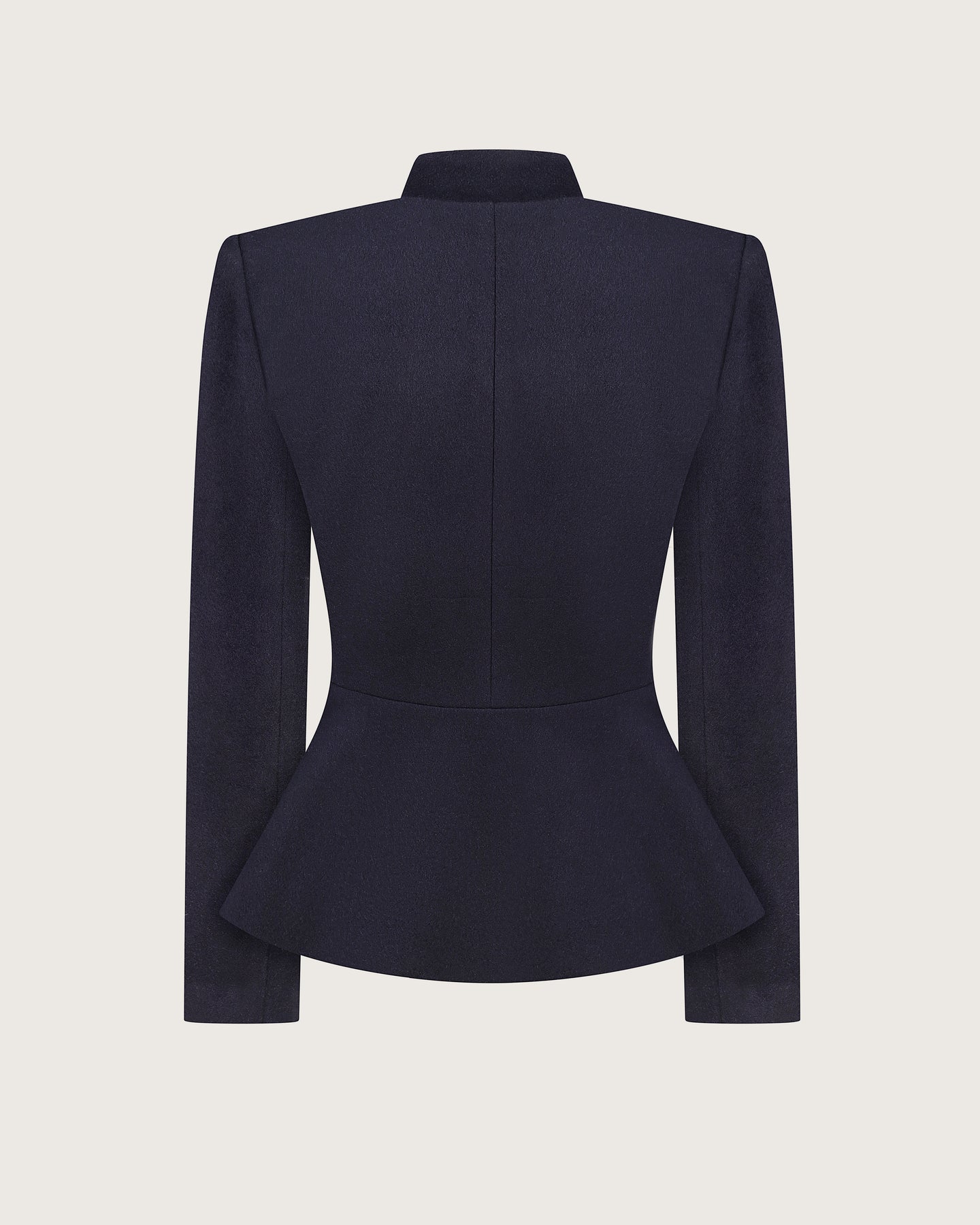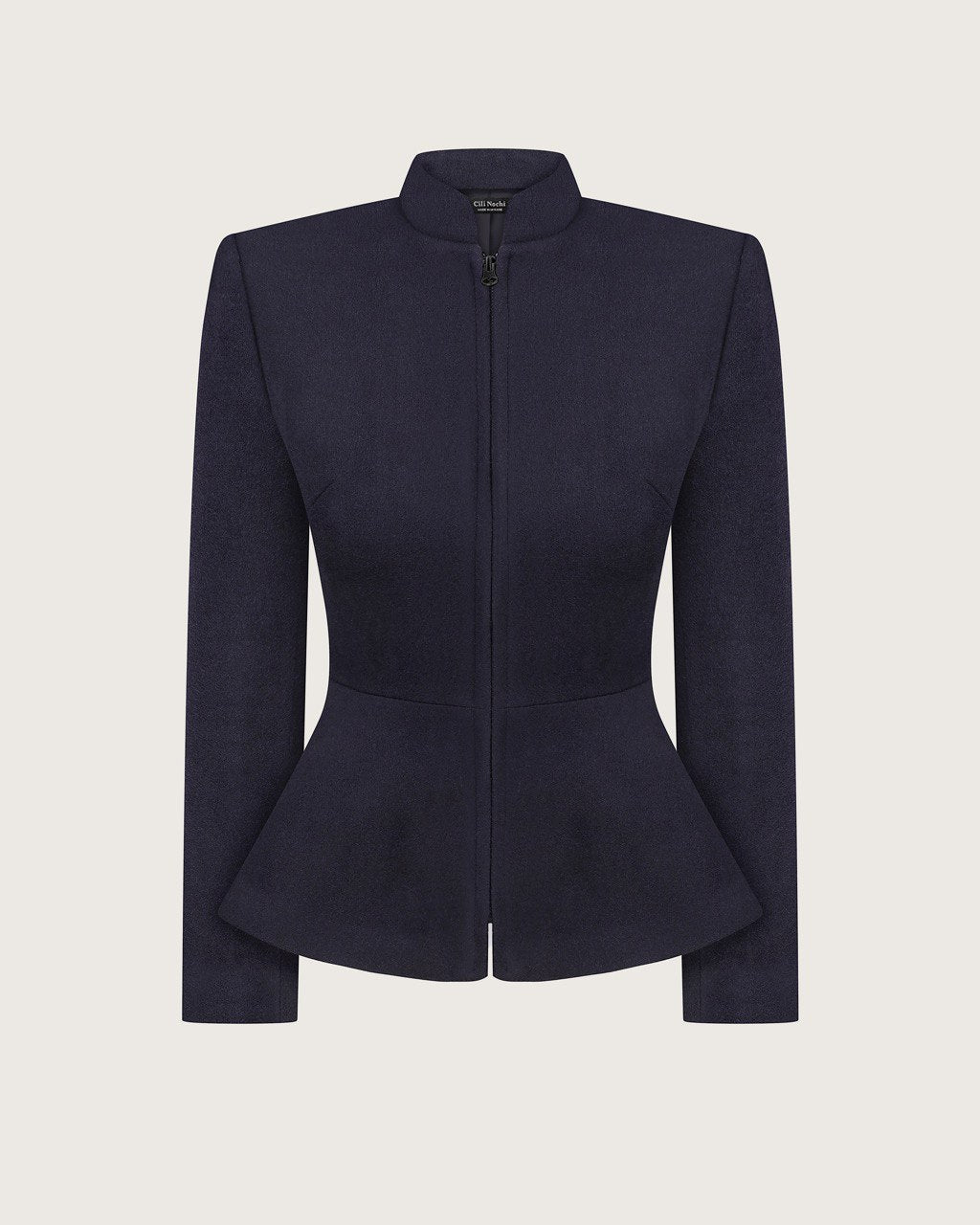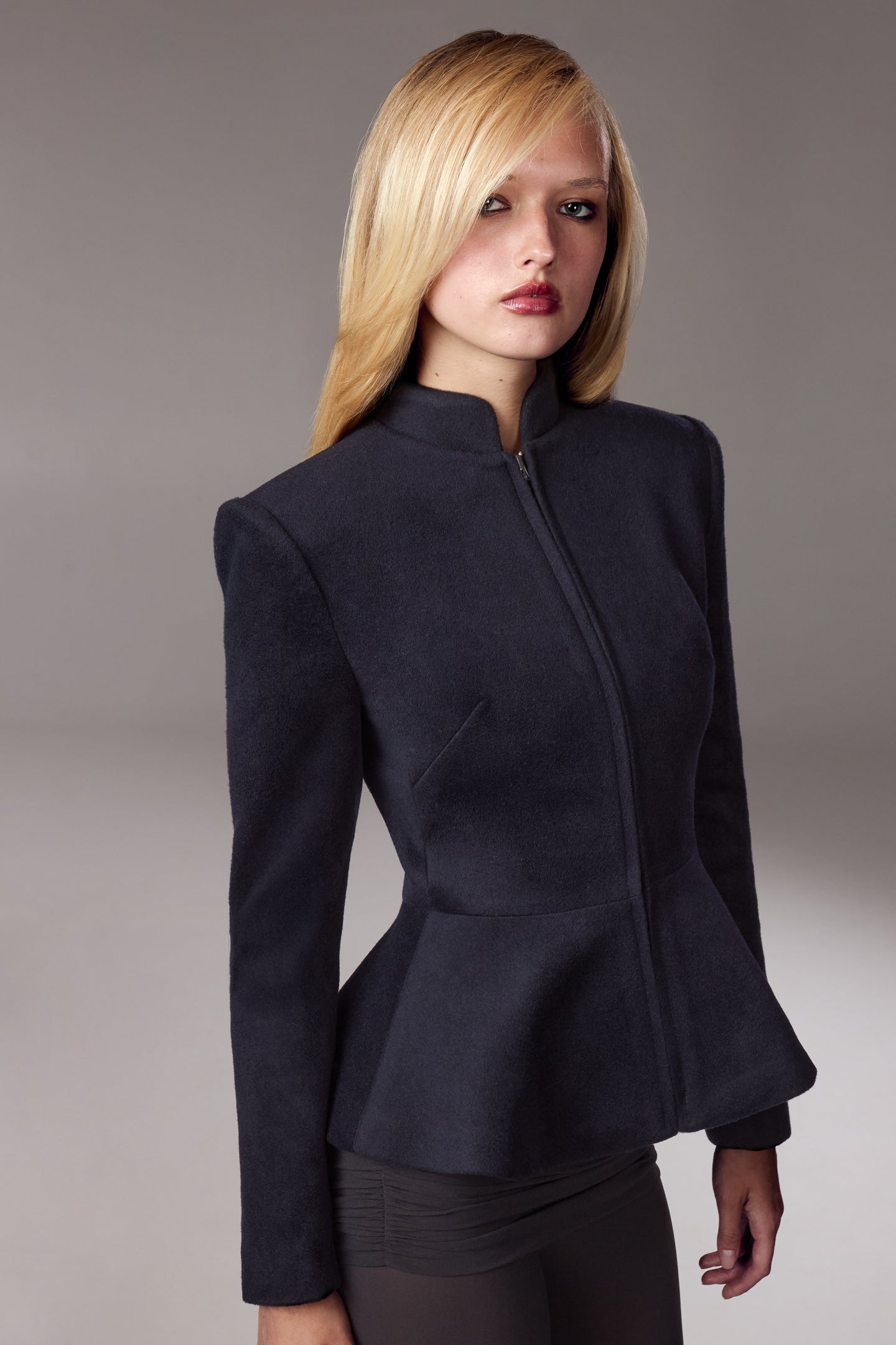 A clean-lined, stand collar jacket in sleek wool. Boldly shouldered yet close-fitting, designed to define the waist. Zip-through.