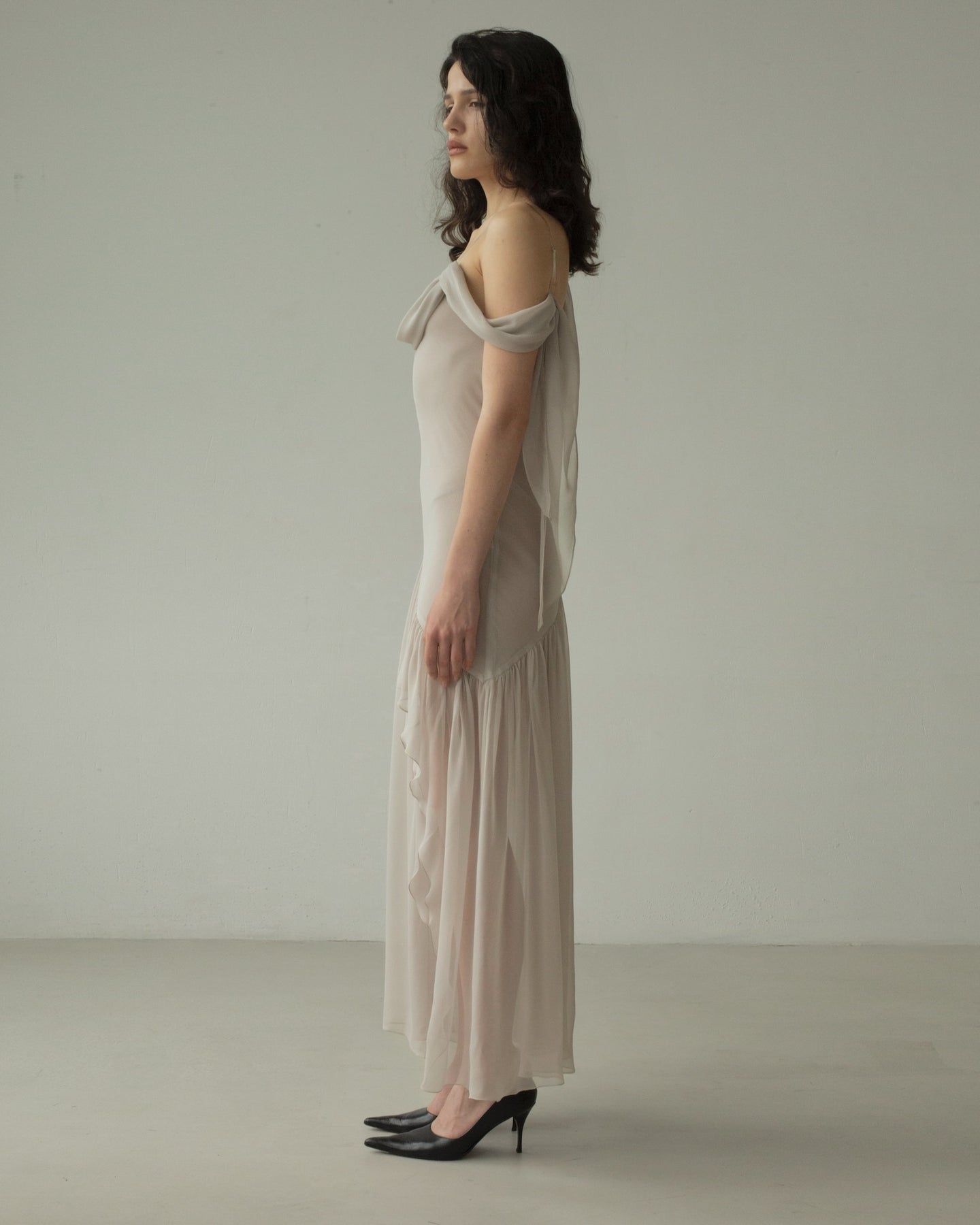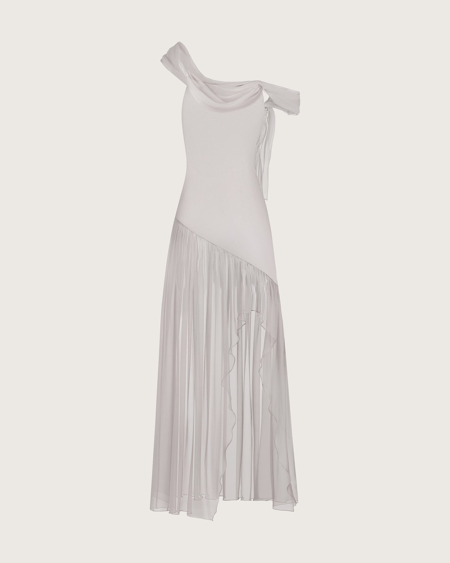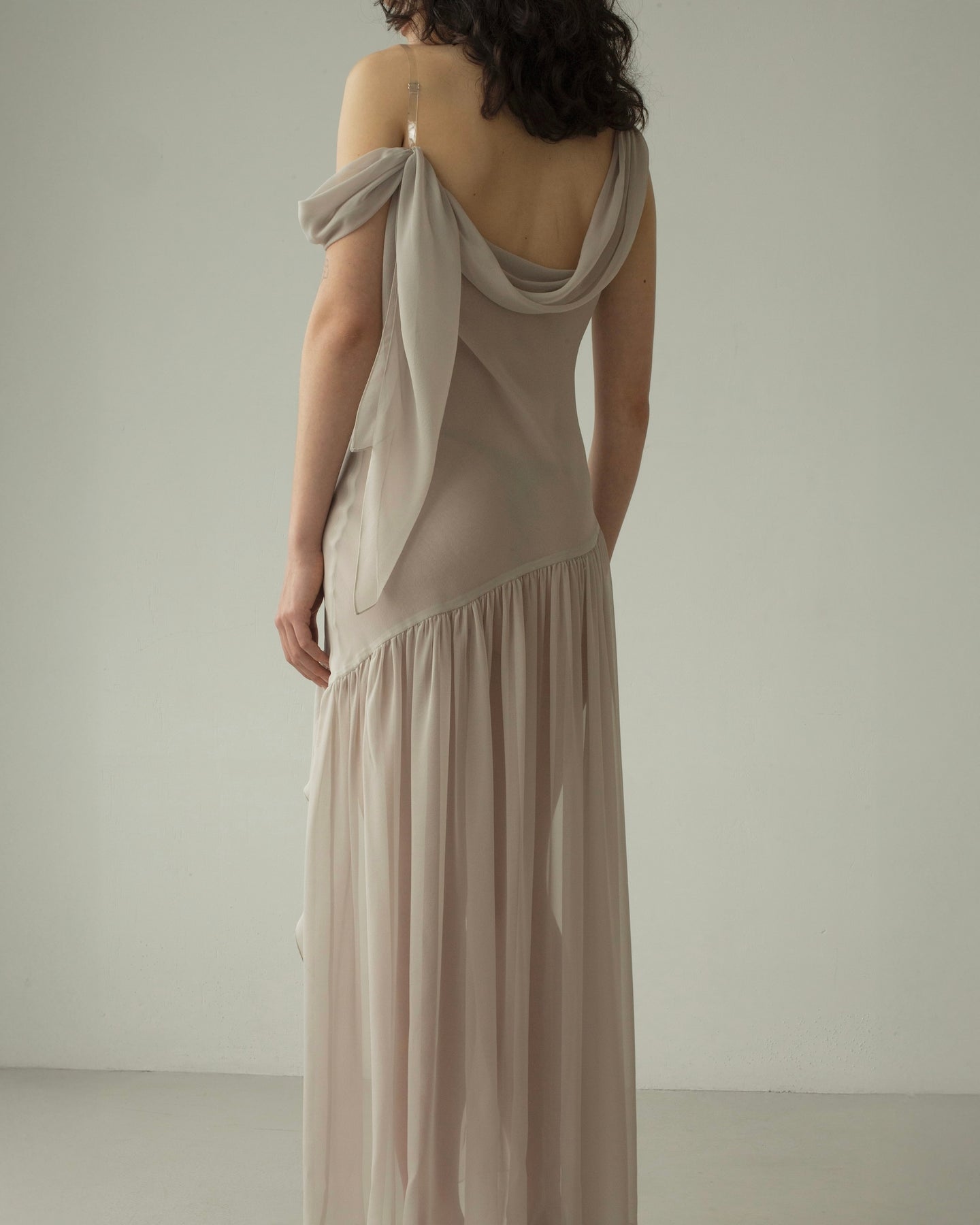 A cloud-like dress in whisper-thin silk, selected for its ethereal lightness. Draped neckline that falls across the shoulder, secured by a translucent strap. A deeply asymmetrical hem cascades down the legs.