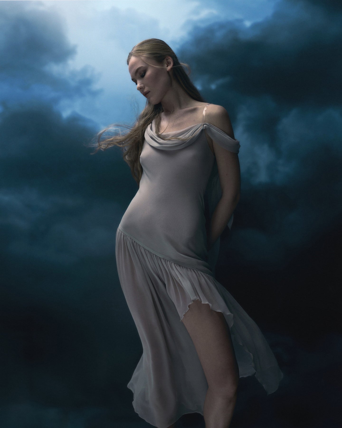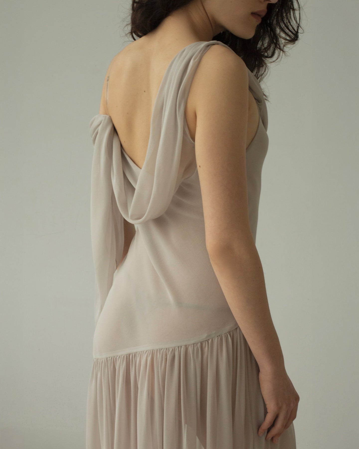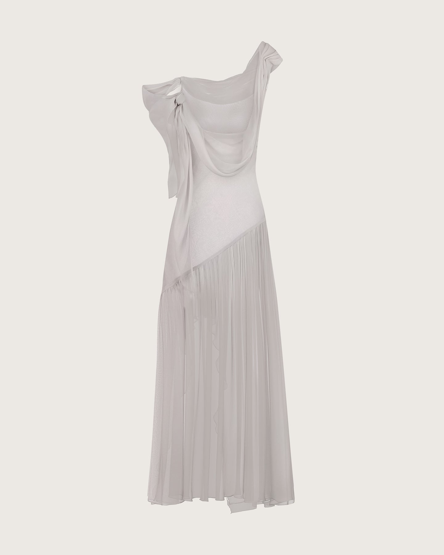 A cloud-like dress in whisper-thin silk, selected for its ethereal lightness. Draped neckline that falls across the shoulder, secured by a translucent strap. A deeply asymmetrical hem cascades down the legs.