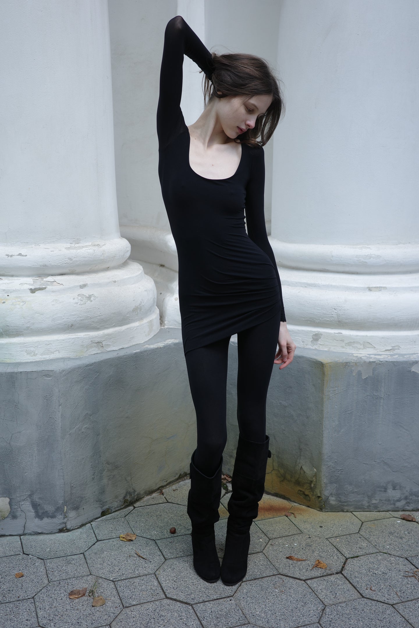 A sleek one-piece that transforms activewear ease into evening allure. Crafted in contouring knit jersey with sinuous stretch, it features a rounded open neckline and draped, skirt-like detail at the waist. Finished with jodhpur straps that accentuate length.