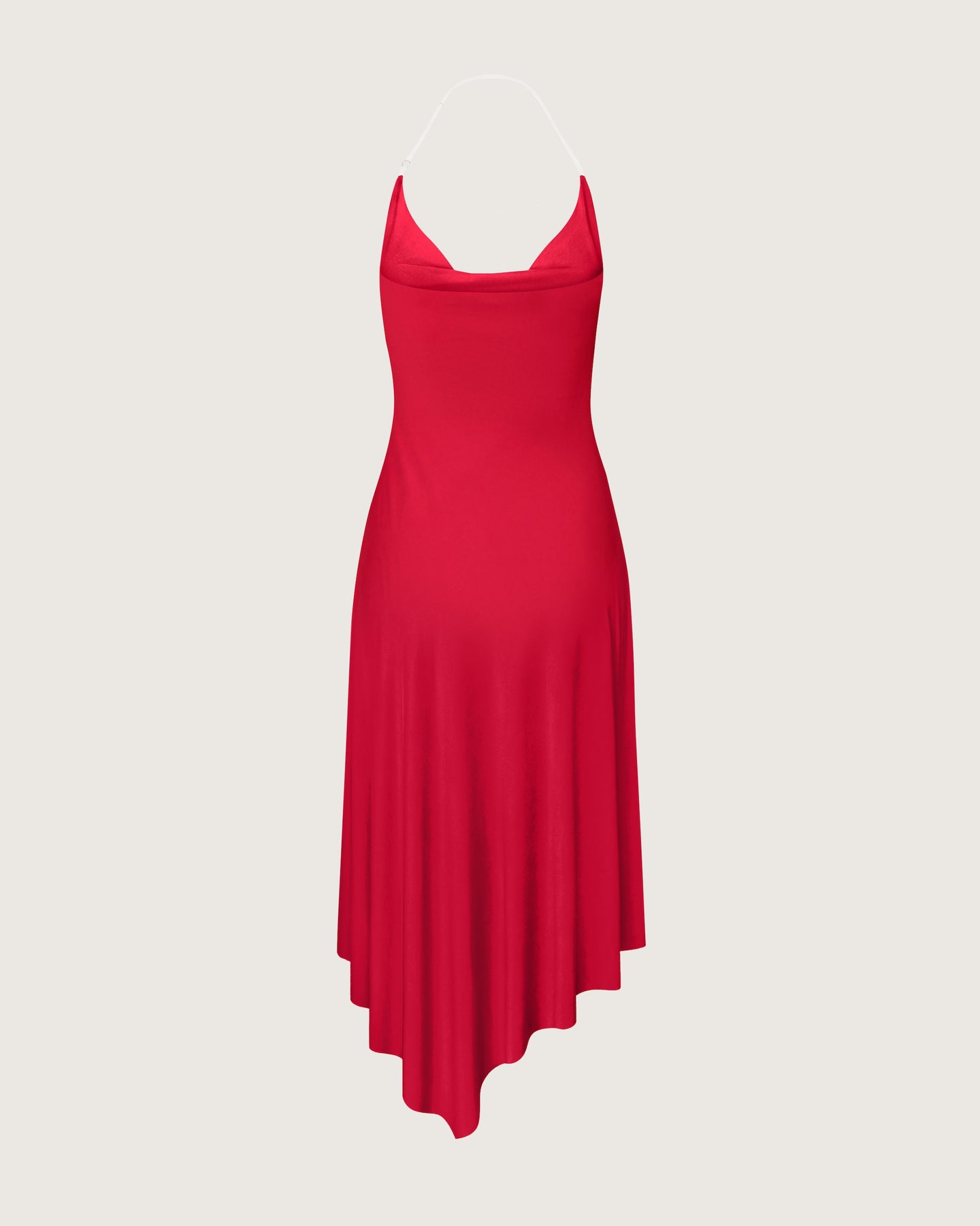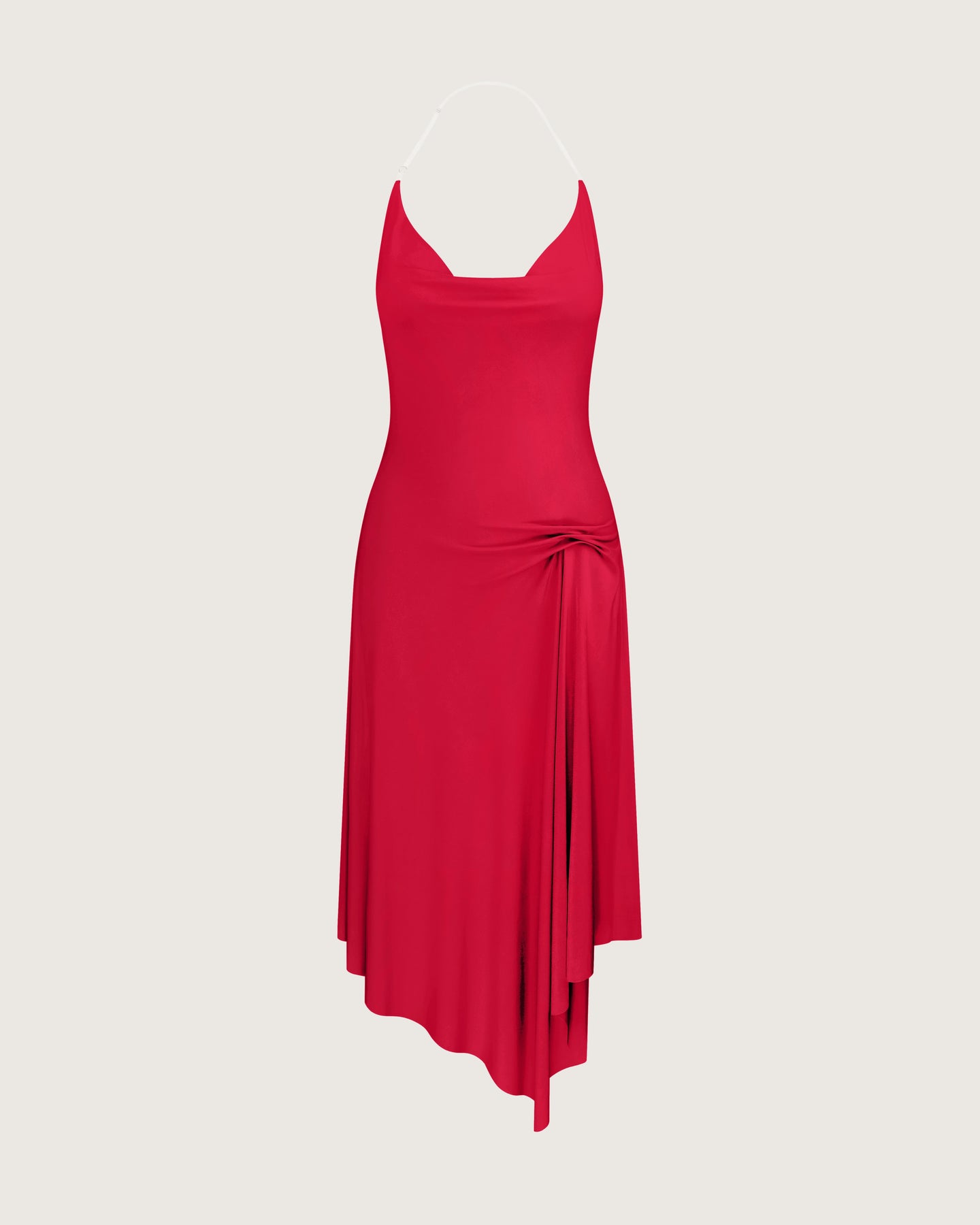 A fluid dress elevated by the exquisite fluidity of lycra. An artfully asymmetric hem is an invitation to movement. The delicately draped neckline is made possible by translucent straps, blurring the boundary between body and raiment.