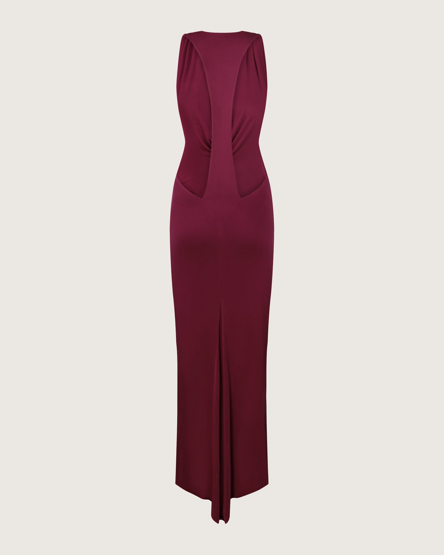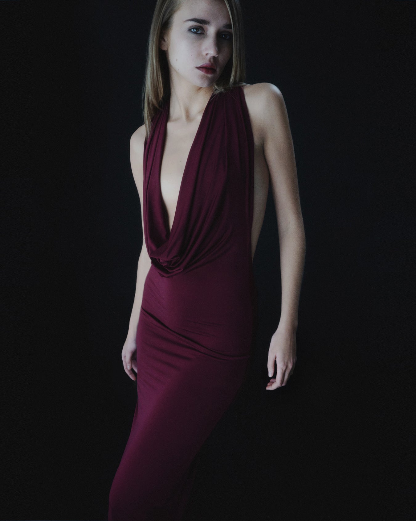 A spare, plunging v-neck dress in sinuous lycra. Dramatic draping softens a form-framing midlength silhouette.